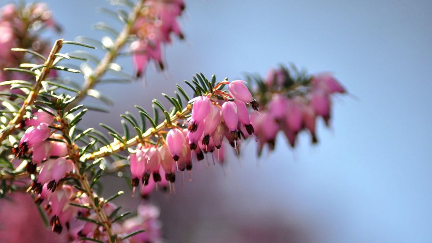 Érica Carnea Folhas brilhantes verde-escuras em forma de agulha e flores tubulares em forma de sino, cor-de-rosa, roxas ou brancas.