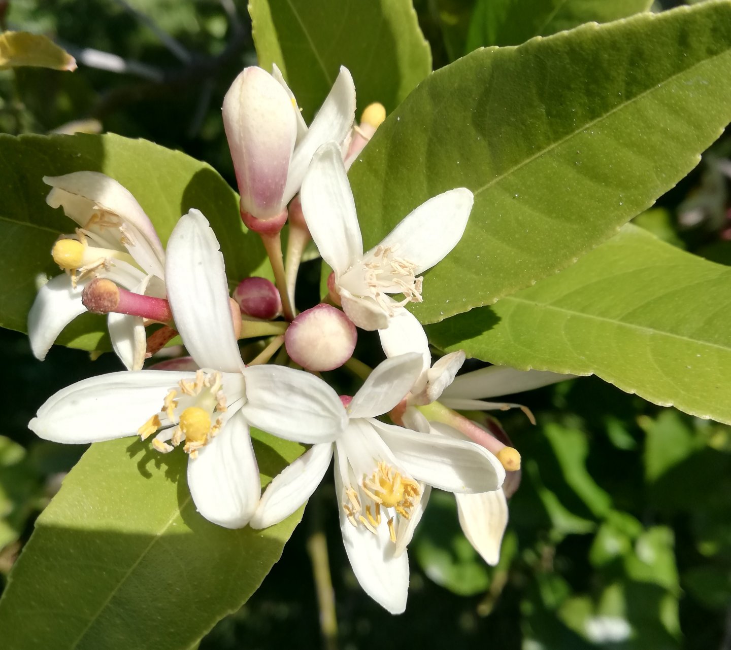 Виростають до 3 м. Темне, блискуче, зелене листя. Білі квіти з фіолетовою основою. Цвіте навесні. Округлі жовті плоди.