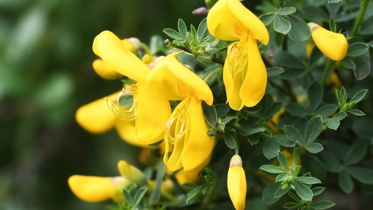 Grande arbusto perene ou caducifólio. Folhas pequenas e simples com flores amarelas brilhantes, semelhantes a ervilhas. Frutos vagem preta - 2,5 - 4 cm.