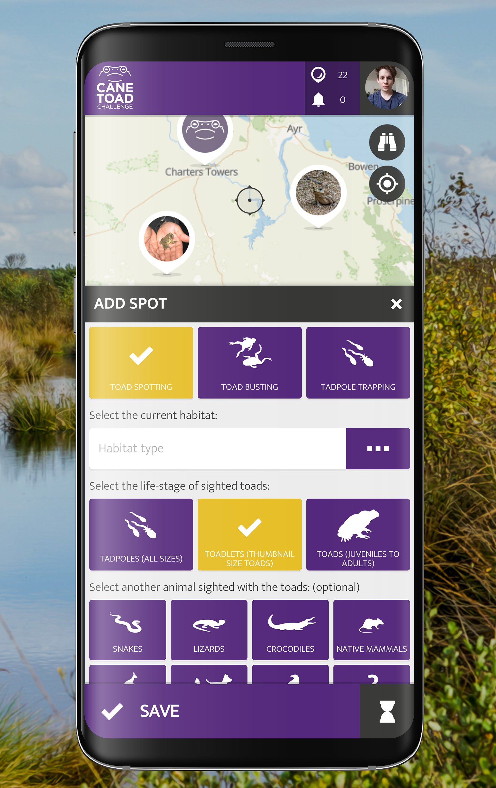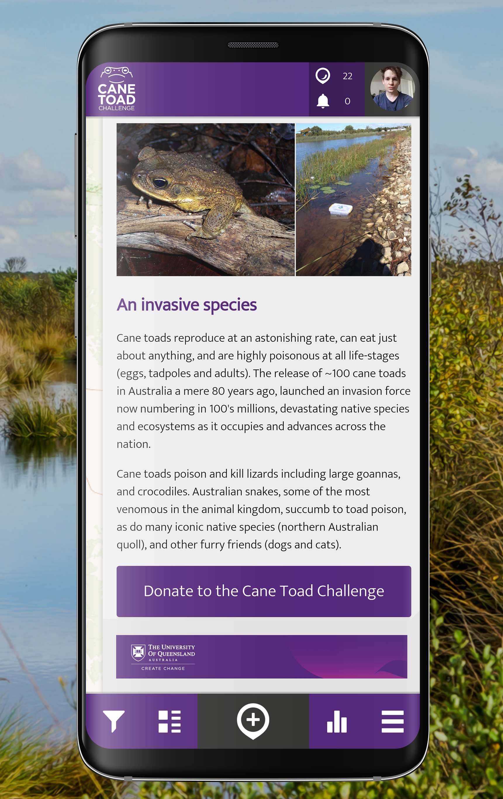 The purpose of the Cane Toad Challenge app is to support citizen science, to inspire the public, media, scientists, authorities and decision-makers, to catalyse awareness and gather data, to inform the development and implementation of more effective cane toad control policies and practices.