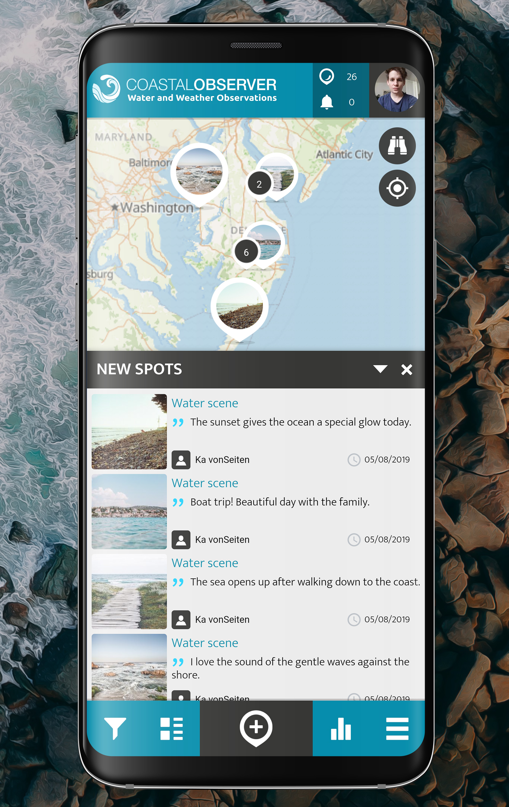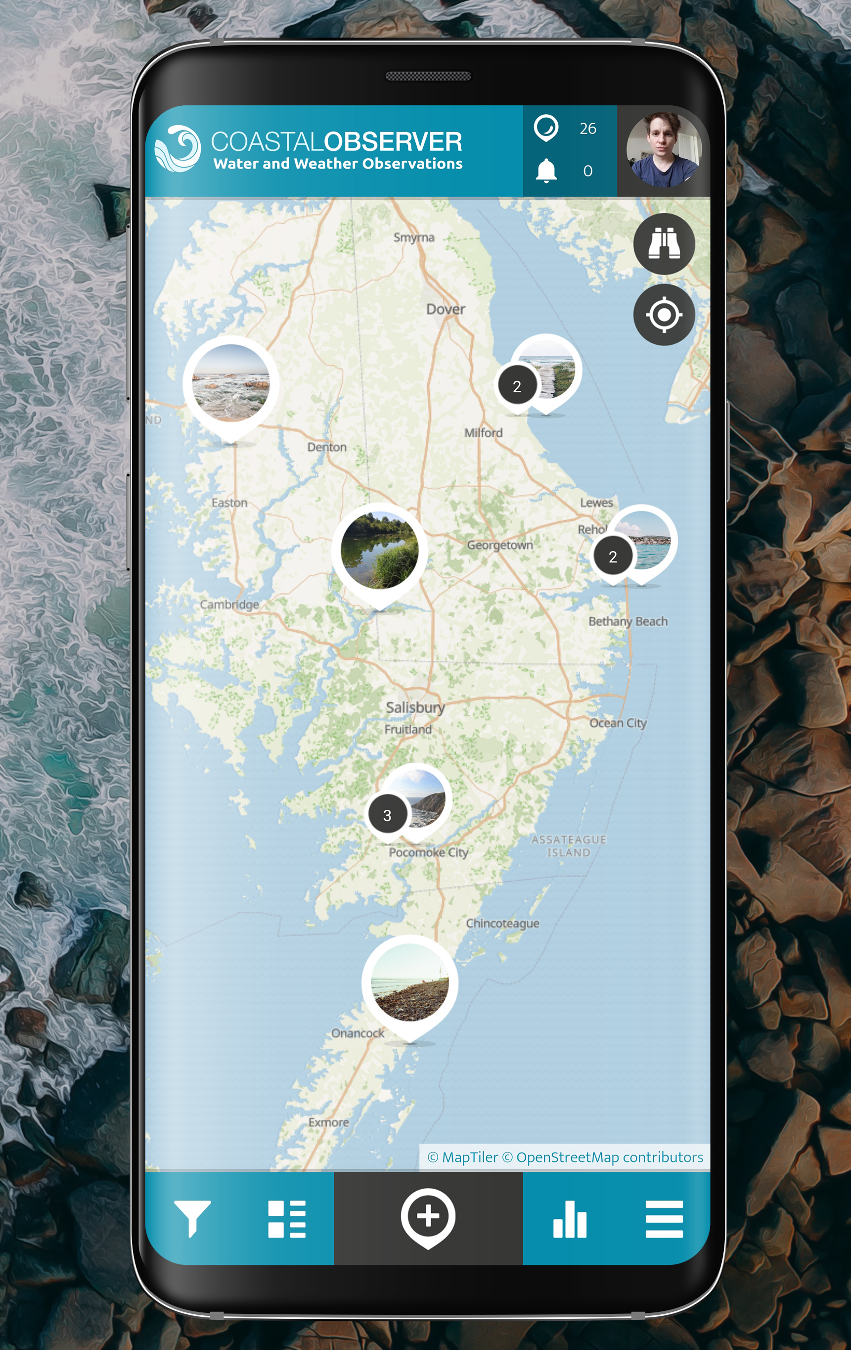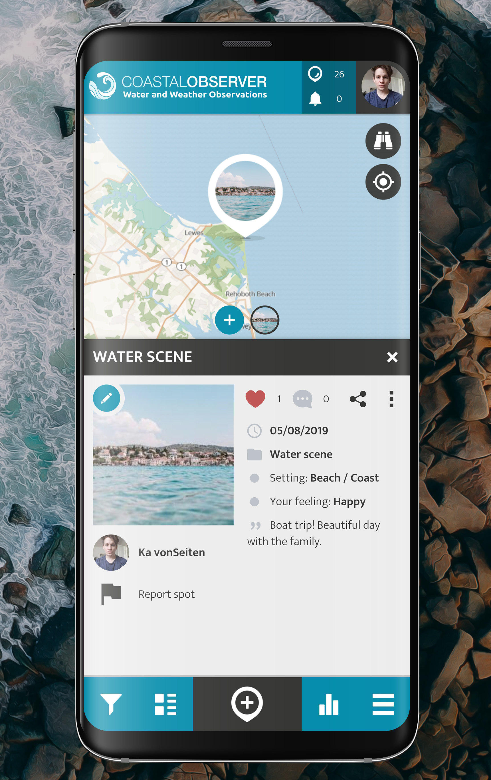 The Coastal Observer Citizen Science project explores these effects and their impact on the environment and our mood. The Coastal Observer App encourages citizens to become active in monitoring weather and water locally, and will help researchers build a pathway for a sustainable future. By contributing observations about floods, tides storms and water quality, you can help the University of Delaware, US, with their research.