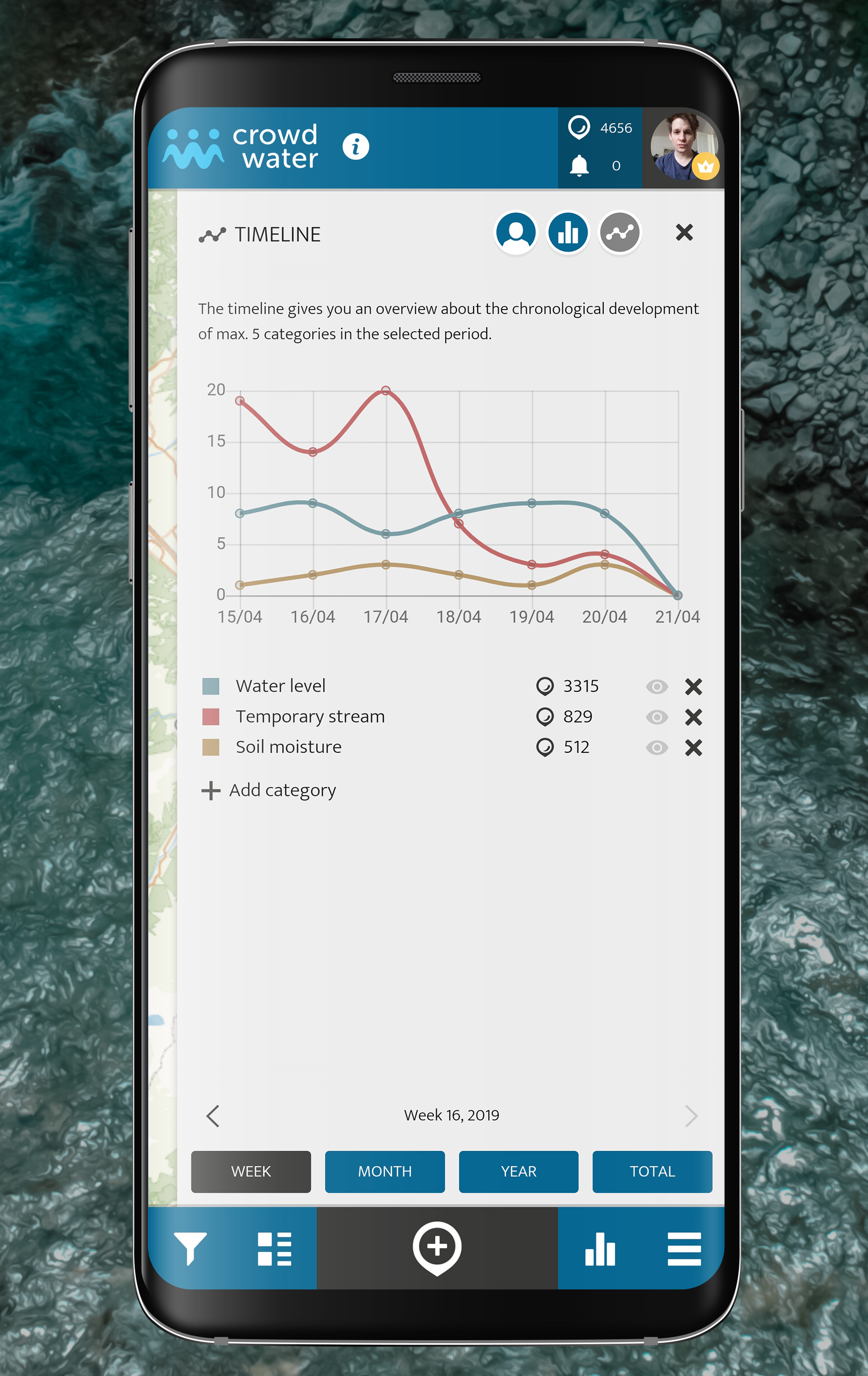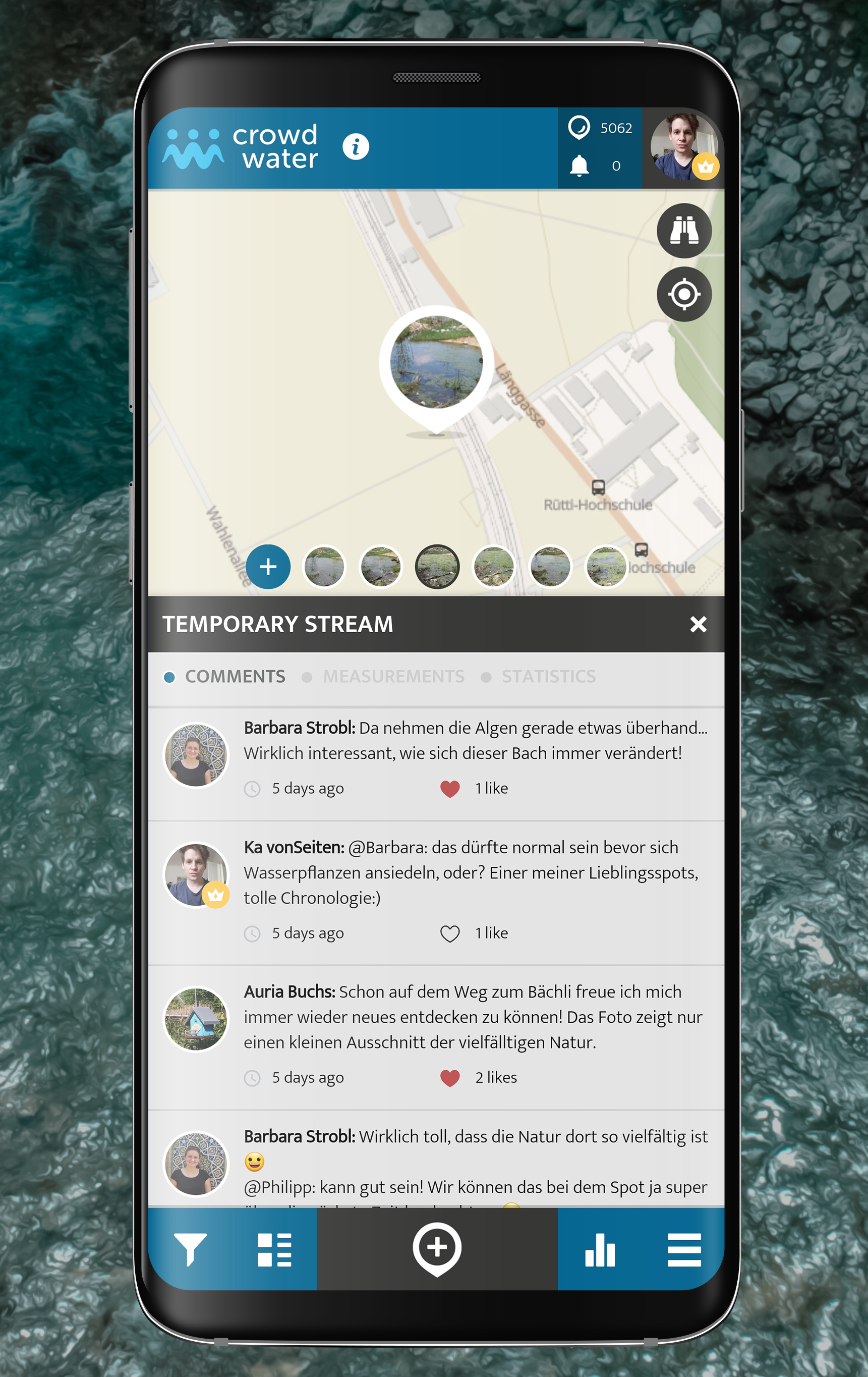 With the CrowdWater Citizen Science app, you can observe rivers and collect hydrological data, including water level, streamflow and soil moisture data, as well as data about the dynamics of temporary streams, plastic pollution and general stream type data.