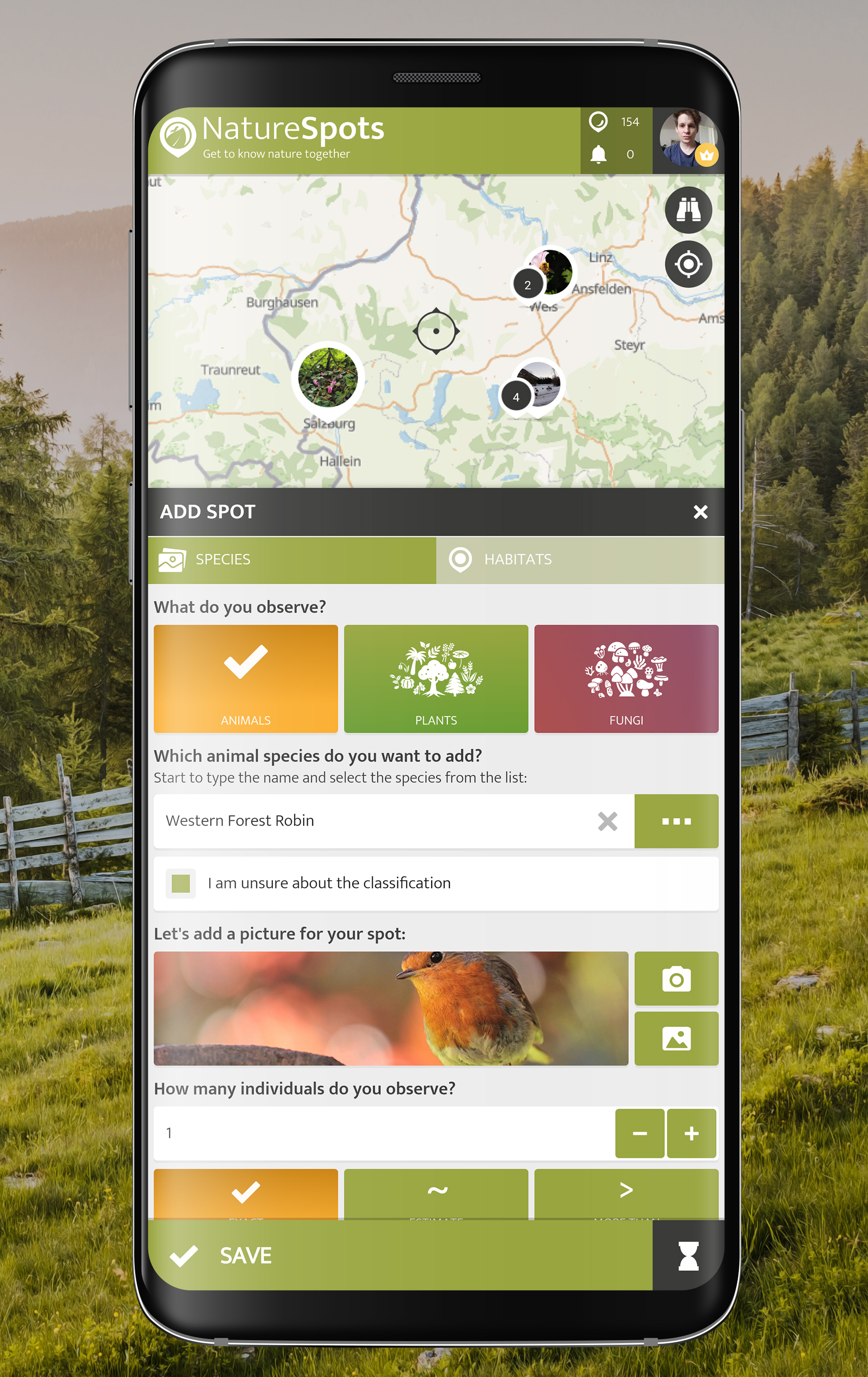 In the App you can share photos with the community and put habitat observations on the map. Participation is easy: take or select a photo of animals, plants and mushrooms and input your classification. The App is working together with Wikipedia, and you can select any animal, plant or mushroom species from around the world! Or simply share a picture of a natural habitat you found.