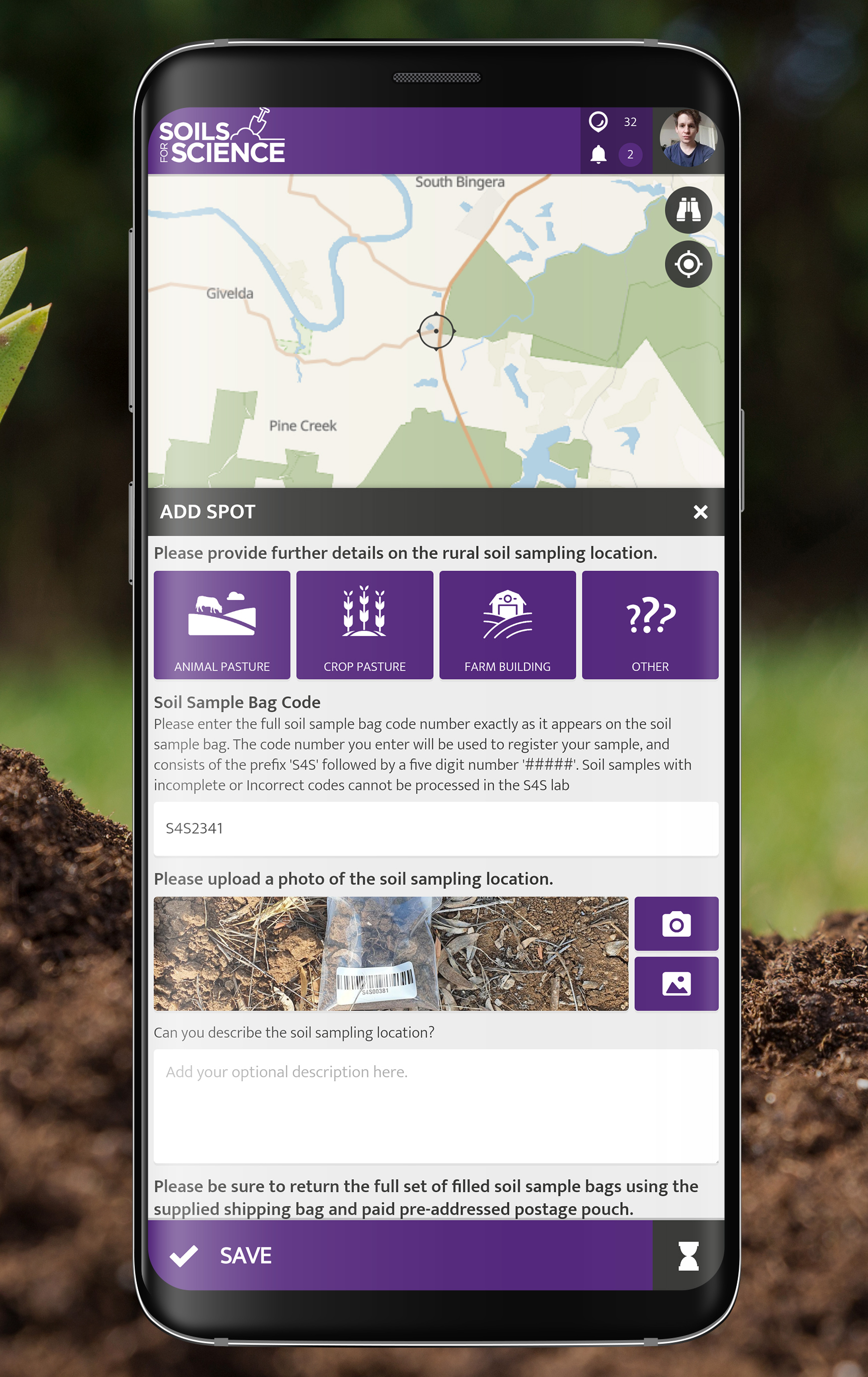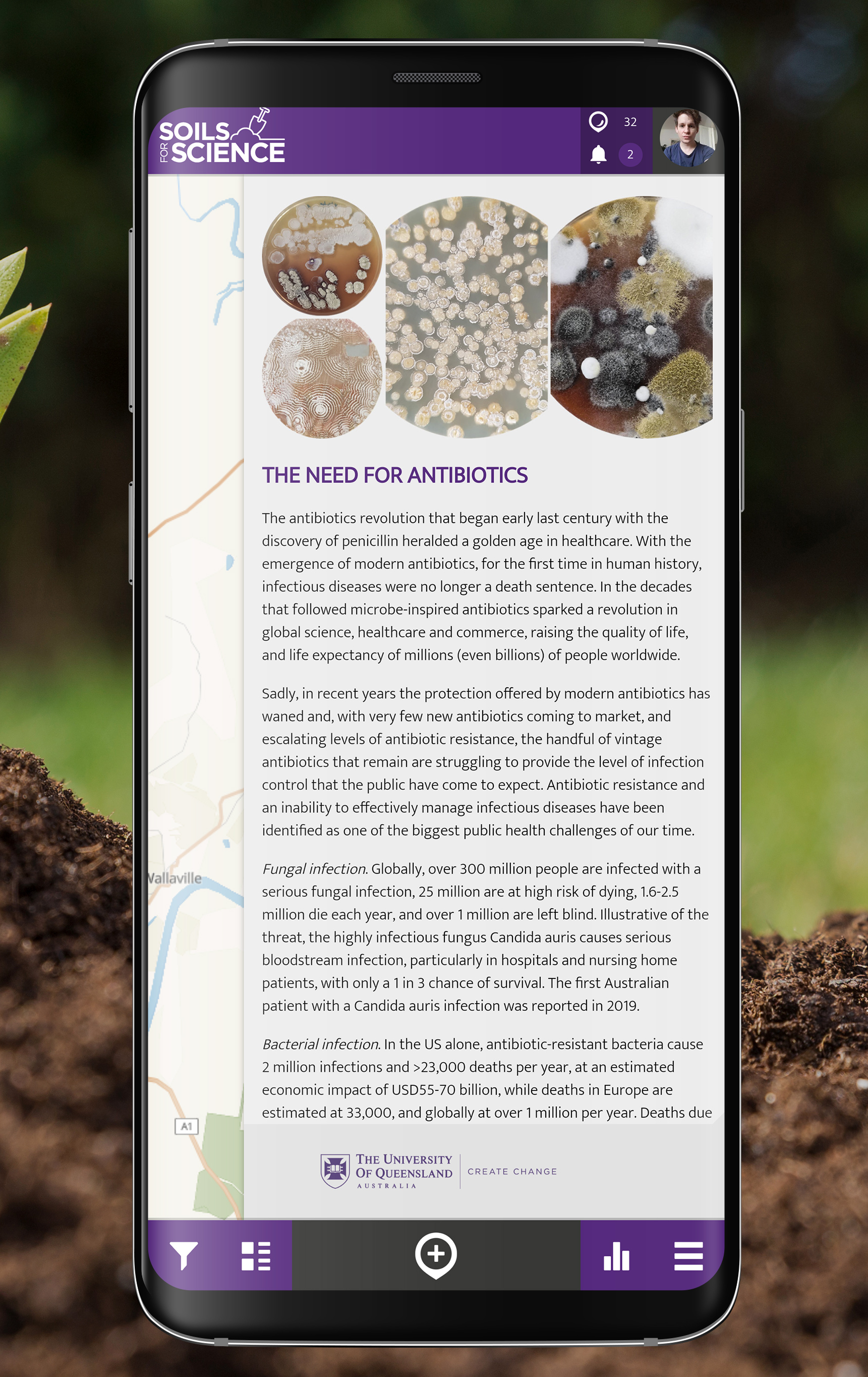 SOILS FOR SCIENCE will provide the Australian public (home and landowners, schools, community, social and sporting groups and others) with educational material on antibiotics and antibiotic resistance, and the important role played by microbes in the past, present and future discovery of antibiotics. S4S also provides a platform for public engagement in citizen science. Registered S4S APP users (Australia only) can submit an online request for a free soil sampling kit (visit soilsforscience.org.au), which include sample bags, a pre-labelled, pre-paid return postage pouch. All microbes isolated from S4S soil samples will be cryopreserved and registered with MICROBES AUSTRALIA, where they will be queued for taxonomic, genomic, chemical and antibiotic profiling. Promising leads will be prioritised for detailed investigation by University of Queensland researchers, to learn more about the microscopic life with Australian soils, and in doing so assist in the discovery of new antibiotics.