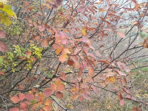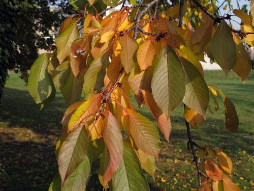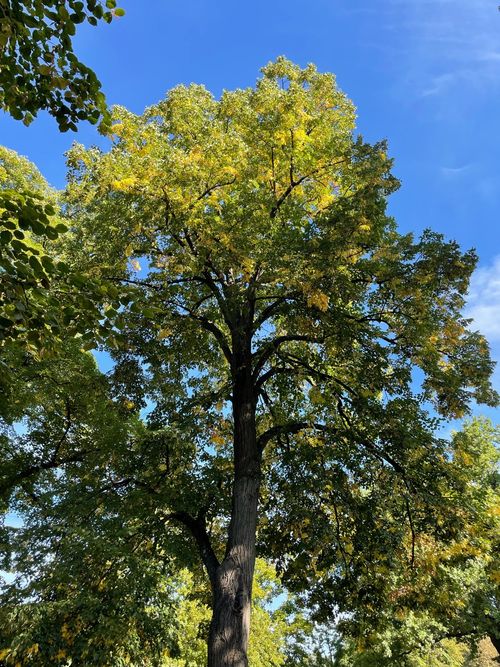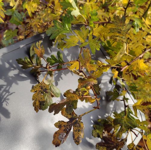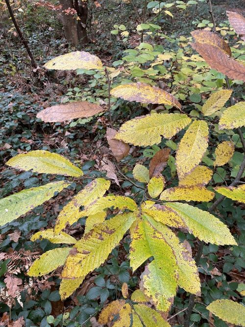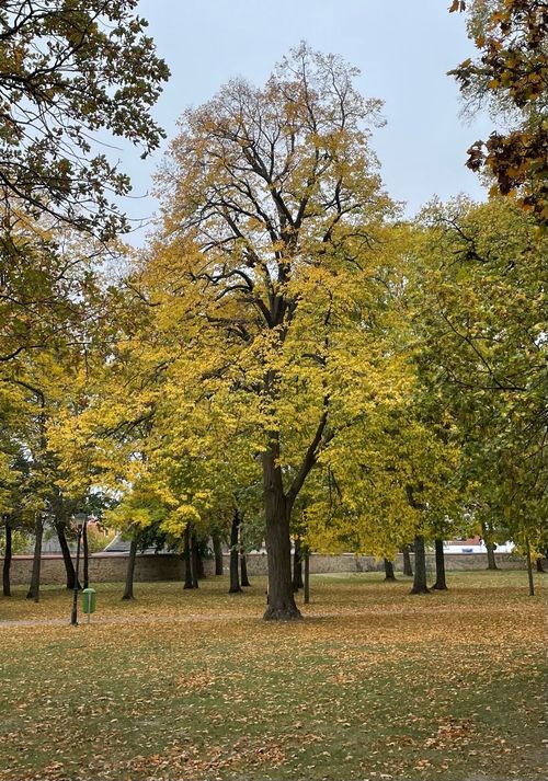 Etwa 50 % der Blätter, inklusive der bereits abgefallenen, sind an mehreren Bäumen verfärbt.