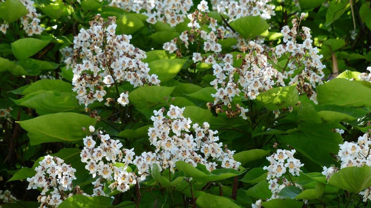 Cresce até aos 18 m. Ramos largos e abertos, retorcidos. Casca de cor laranja a castanho-rosada. Folhas grandes (15-30 cm), em forma de coração na base e pontiagudas no topo. Flores brancas com amarelo-púrpura. Frutos: vagens de 40 cm.