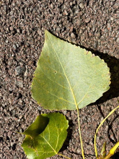 - Blätter: dreieckig bis rhombisch, 7-10cm lang, Rand gekerbt, Blattstiel abgeflacht, rötlich