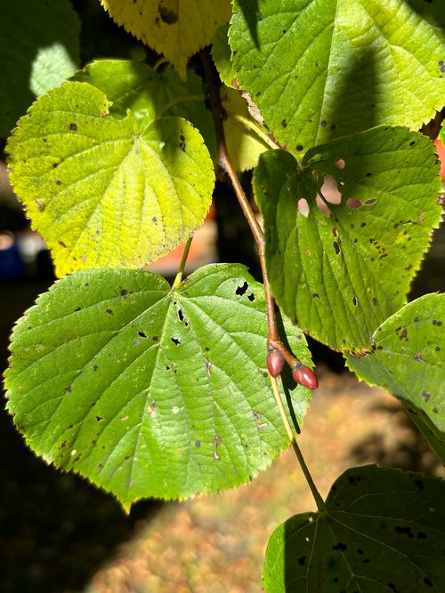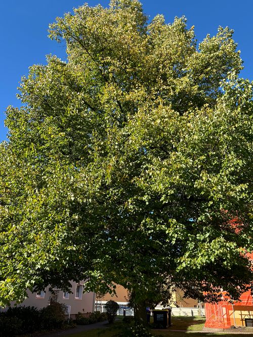 Tilia platyphyllos Wuchshöhe: bis 30 m Stamm: Rinde grau bis schwarzbraun, längsrissig Blätter: herzförmig, 7-15 cm lang, am Stiel schief angesetzt, Rand gesägt, Blattoberseite locker behaart, heller Filz in Achseln der Blattadern Knospen: eiförmig Blüte: im Juni/Juli, stark duftend, insektenfreundlich Früchte/Samen: kleine, kugelige Nussfrüchte (ca. 5 mm) an Stiel mit 1 Flügelchen Sonstiges: häufiger Stadt- und Straßenbaum Fotos: Janina Deutschmann (1,2)