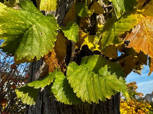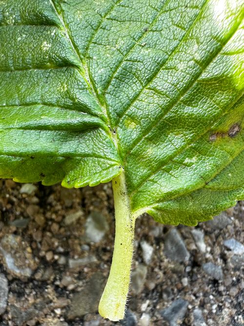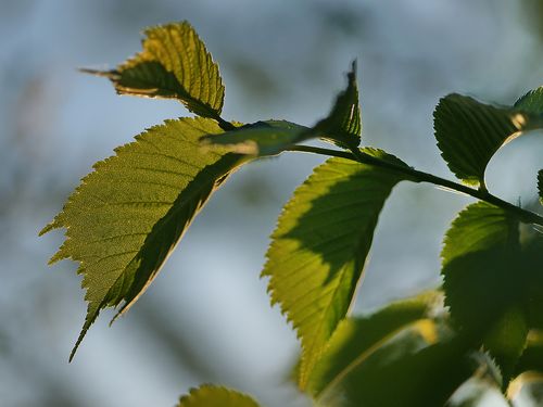 - Blätter: verkehrt-eiförmig bis elliptisch, mit deutlich asymmetrischen Blattansatz am Stiel, mehr oder weniger stark behaart, Blattrand gesägt, raschelnd