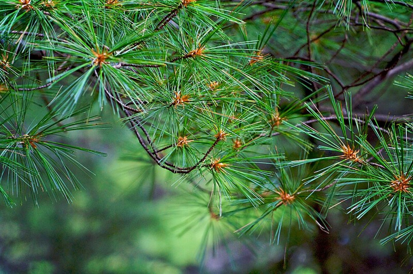 Pinus strobus Wuchshöhe: bis 30 mStamm: Rinde lange glatt, graugrün glänzend, späte Borkenbildung, längsrissige Schuppenborke Krone: locker kegelförmig Blätter: 5 Nadeln pro Nadelscheide, 7-12 cm lang, sehr dünn, weich, biegsam Früchte/Samen: Zapfen schmal zylindrisch, bis zu 20 cm lang, meist gebogen