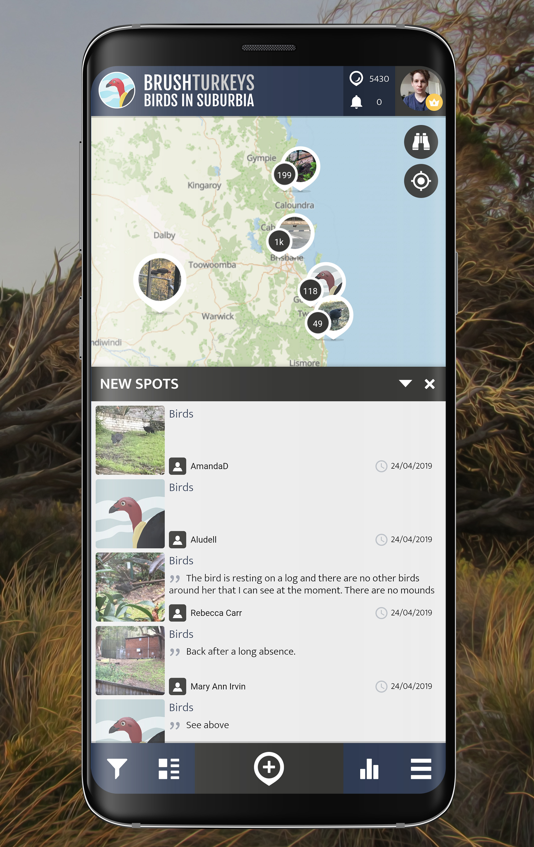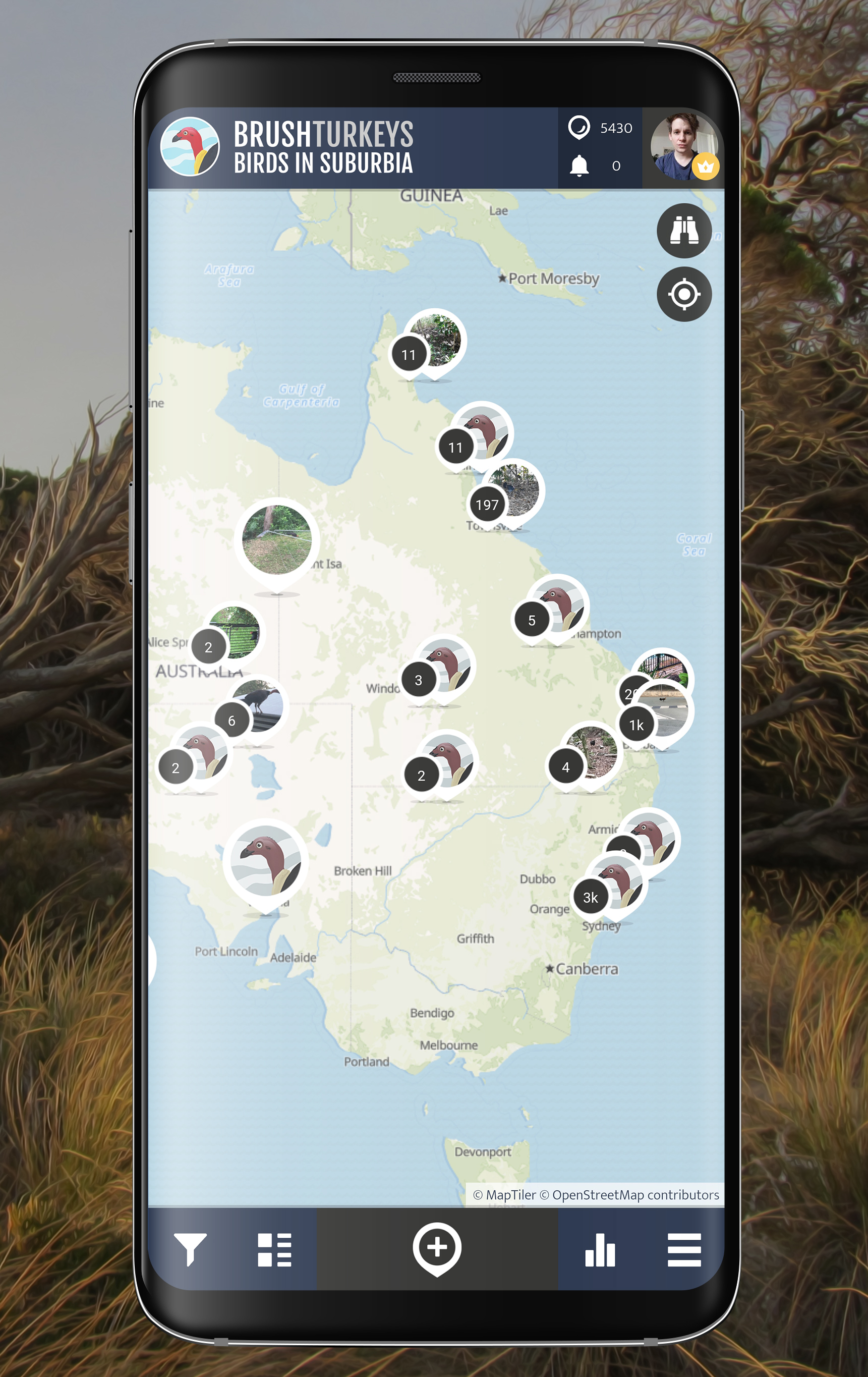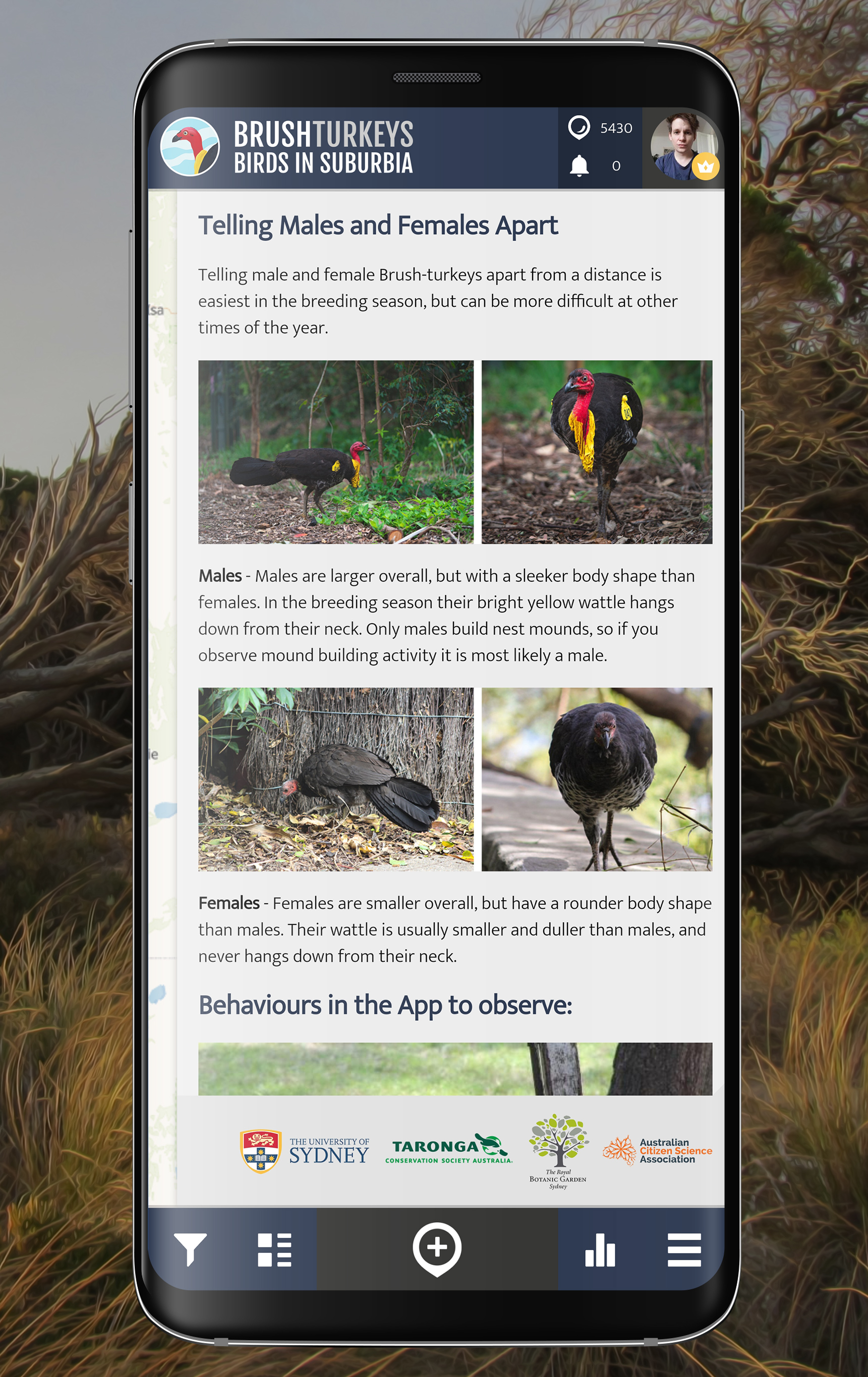 Mit der App kannst du Sichtungen des australischen Buschhuhns sammeln und deren Verhalten beobachten. Deine Beobachtungen helfen besser zu verstehen, wie sich diese Vögel an ihre Umgebung anpassen.