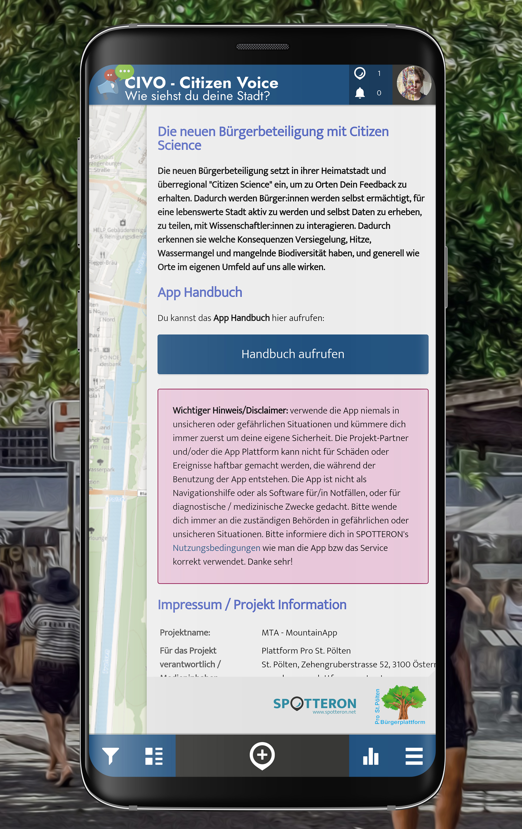 Citizen Voice setzt in ihrer Heimatstadt und überregional "Citizen Science" ein, um zu Orten Dein Feedback zu erhalten. Dadurch werden Bürger:innen selbst ermächtigt, für eine lebenswerte Stadt aktiv zu werden und selbst Daten zu erheben, zu teilen, mit Wissenschaftler:innen zu interagieren. Dadurch erkennen sie welche Konsequenzen Versiegelung, Hitze, Wassermangel und mangelnde Biodiversität haben, und generell wie Orte im eigenen Umfeld auf uns alle wirken.
