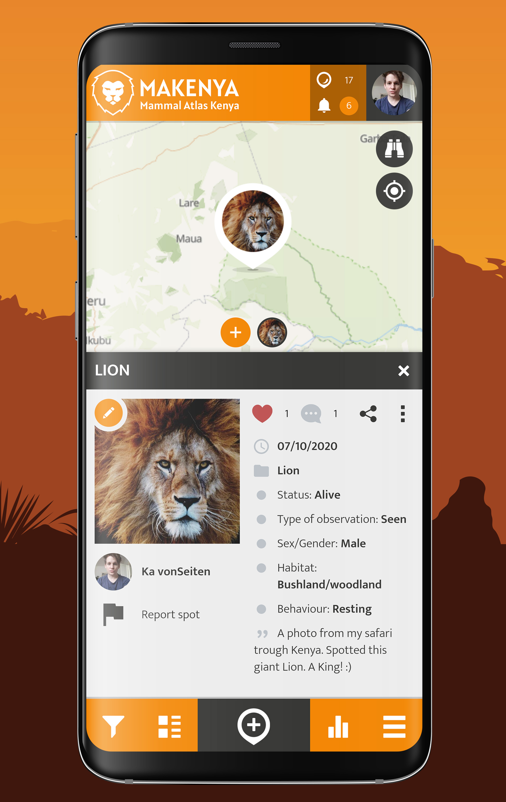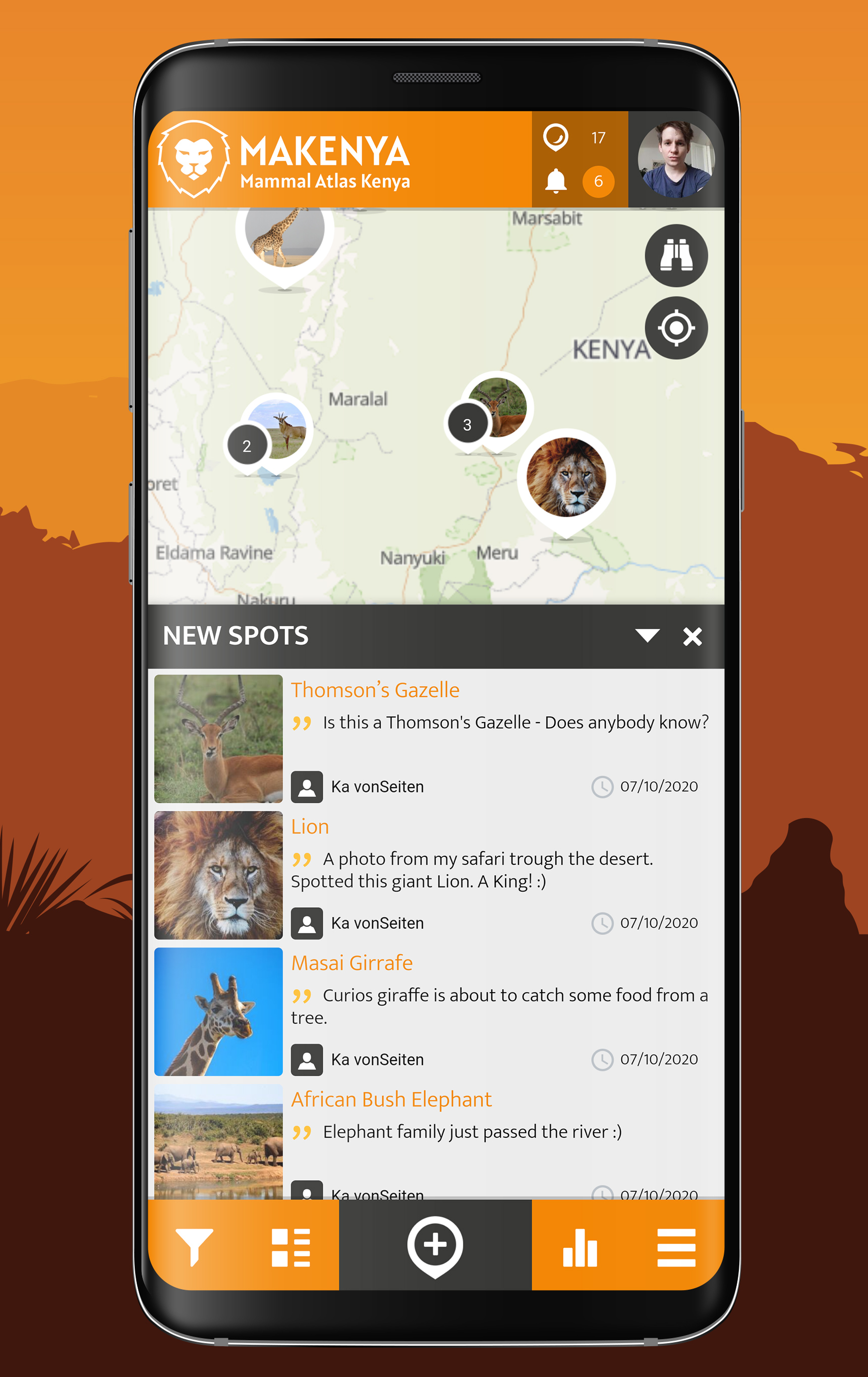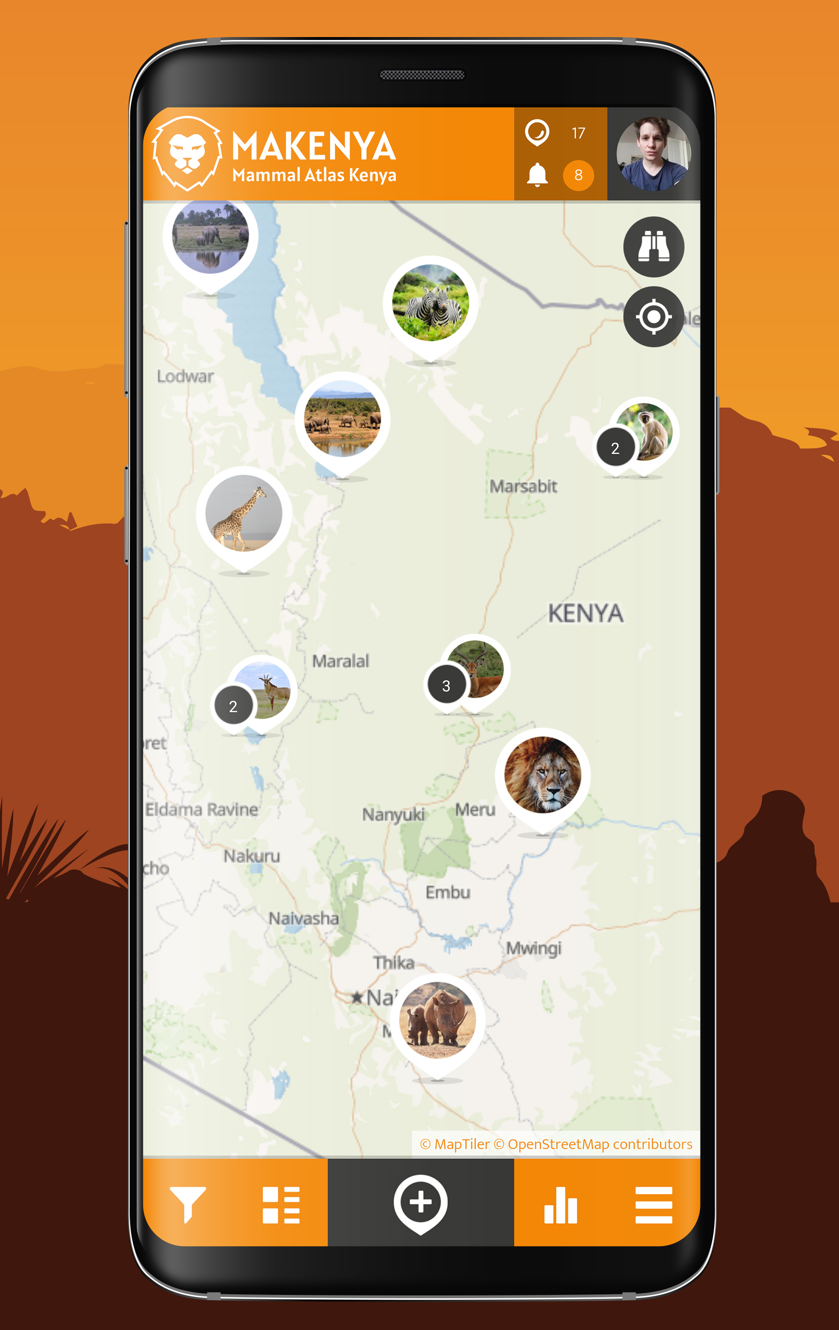 In der MAKENYA – Mammal Atlas Kenya App kannst du die faszinierende Welt der Säugetiere erkunden und mit forschen. Entdecke über 390 Arten und werde Teil der ersten Säugetier-Monitoring-App Kenias. Teile deine Fotografien und Beobachtungen mit einer Community von Tier-LiebhaberInnen, ForscherInnen, WissenschaftlerInnen und BürgerInnen und hilf dabei Verhalten und Verbreitung der Säugetiere in Kenia besser zu verstehen.