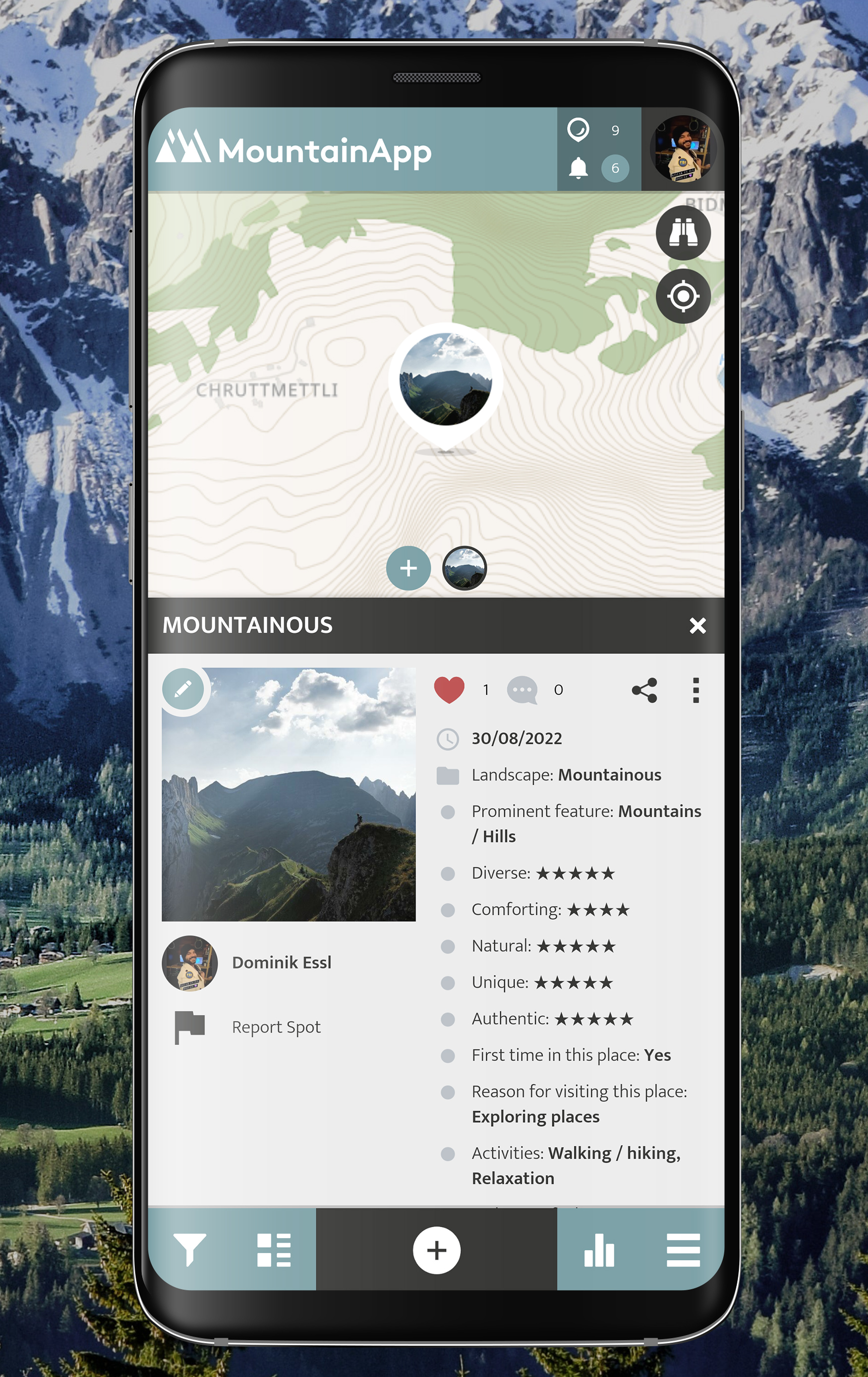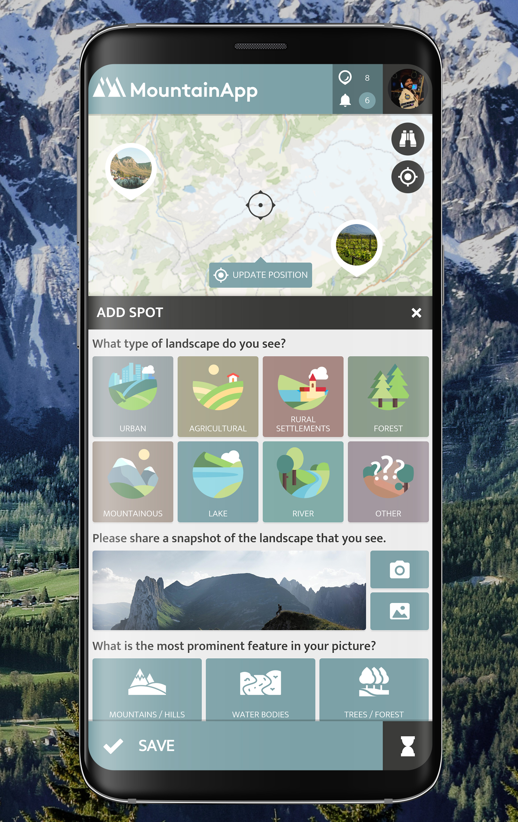 MTA - MountainApp will Menschen dazu inspirieren, sich mit der Landschaft in ihrer Umgebung zu befassen. Mit MTA - MountainApp möchte mehr über die Bedeutung von Landschaften im alltäglichen Leben von Menschen in verschiedenen europäischen Ländern erfahren. Durch das Sammeln dieser Daten werden Beziehungen, die Menschen zu verschiedenen Landschaftselementen haben, erforscht. Das Projekt hat zum Ziel, die mit Landschaften verbundenen gesellschaftlichen Werte und Bedeutungen zu analysieren.