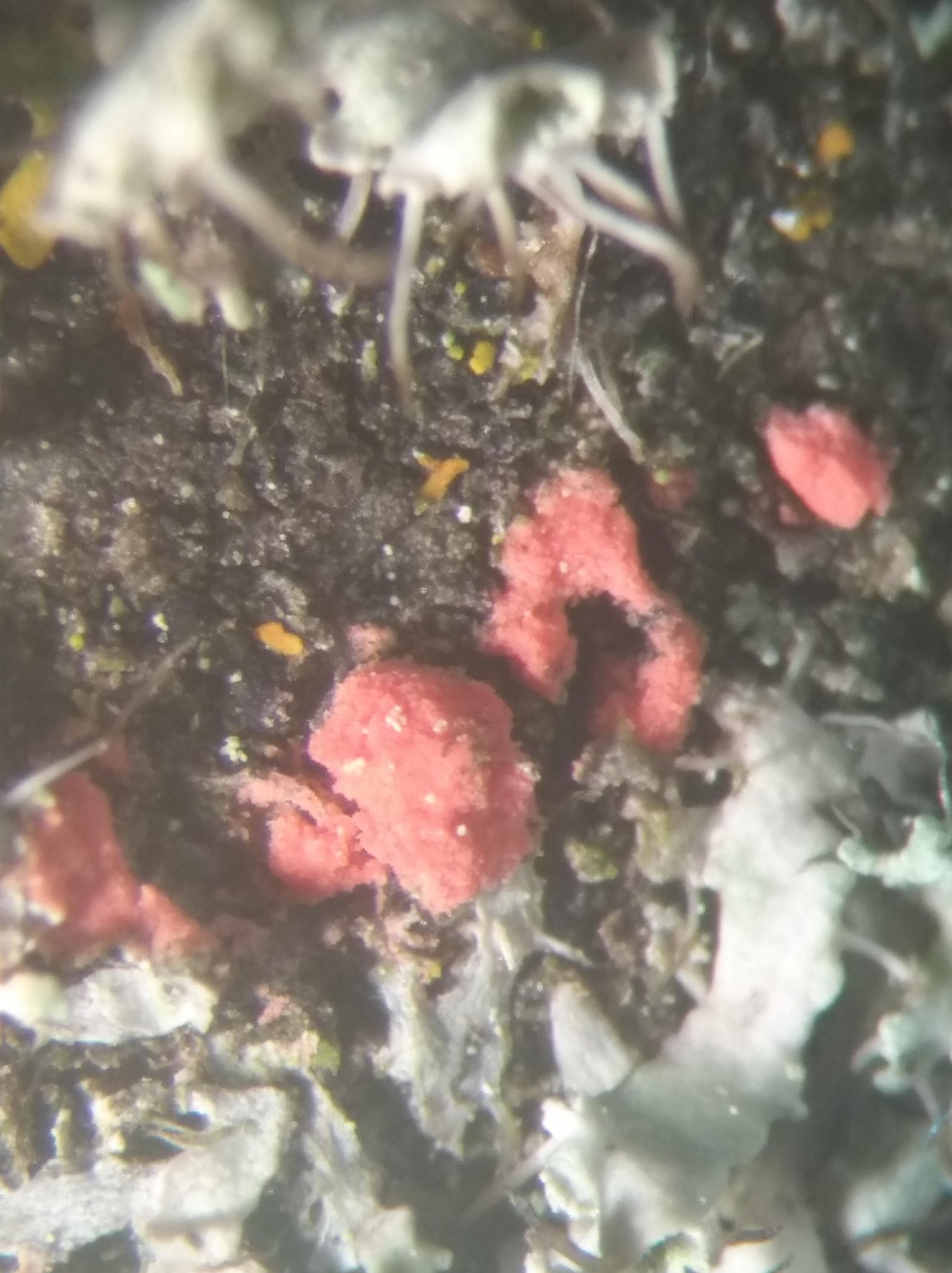 Andere Art spotted by Helmling: “Winzig, aber durch knallige Farbe auffällig; auf abgefallenem Ast; Marchandiomyces corallinus wäre ja sehr ähnlich...” in the Pilzfinder App on 26.12.2020