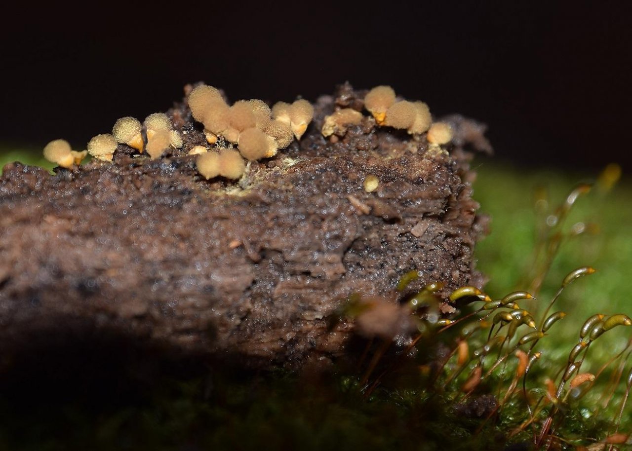 Winzige Pilzaggregate (2mm) von gelblicher Farbe, auf totem Holz, trotz der Kleinheit bei Berührung stark gelb staubend; unter dem Mikroskop ein Kelchförmiger Grundkörper (wie bei den Teuerlingen) auf dem ein wirres Haargeflecht sitzt, nachdem unklar war, ob die Bilder beim schlechten Licht überhaupt etwas werden, wurde davon auch eine Probe mitgenommen. die Bilder zeigen jeweils die gleiche Gruppe, nur immer mehr ausgeschnitten” in the Pilzfinder App on 13.12.2020