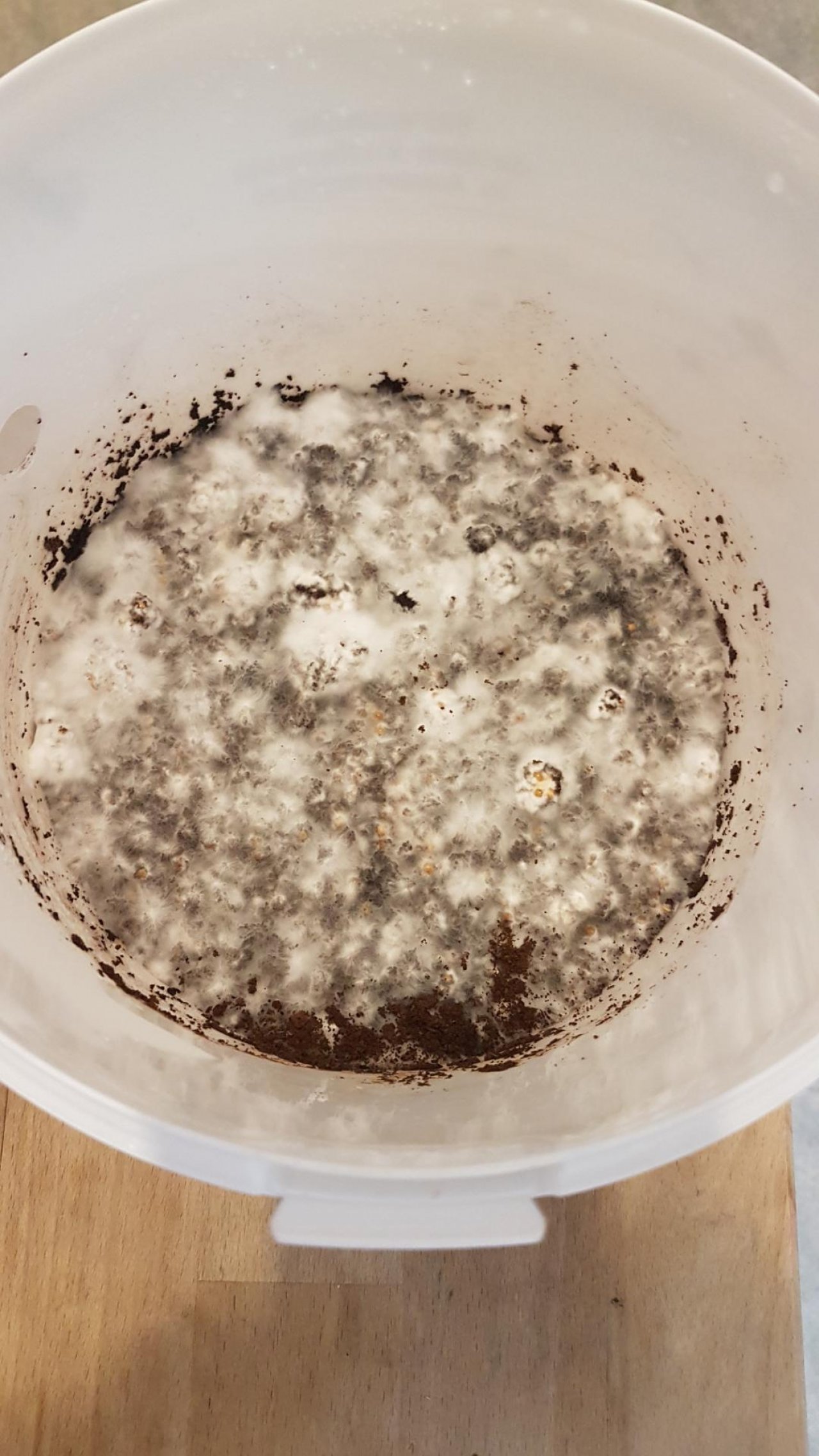 anderer Lamellenpilz (hell) spotted by Ka vonSeiten: “Austernpilzzucht Tag 2: jetzt wirds wohl Zeit zum nachfüttern.. Kaffeesatz von heute kühlt schon aus :)” in the Pilzfinder App on 02.01.2021