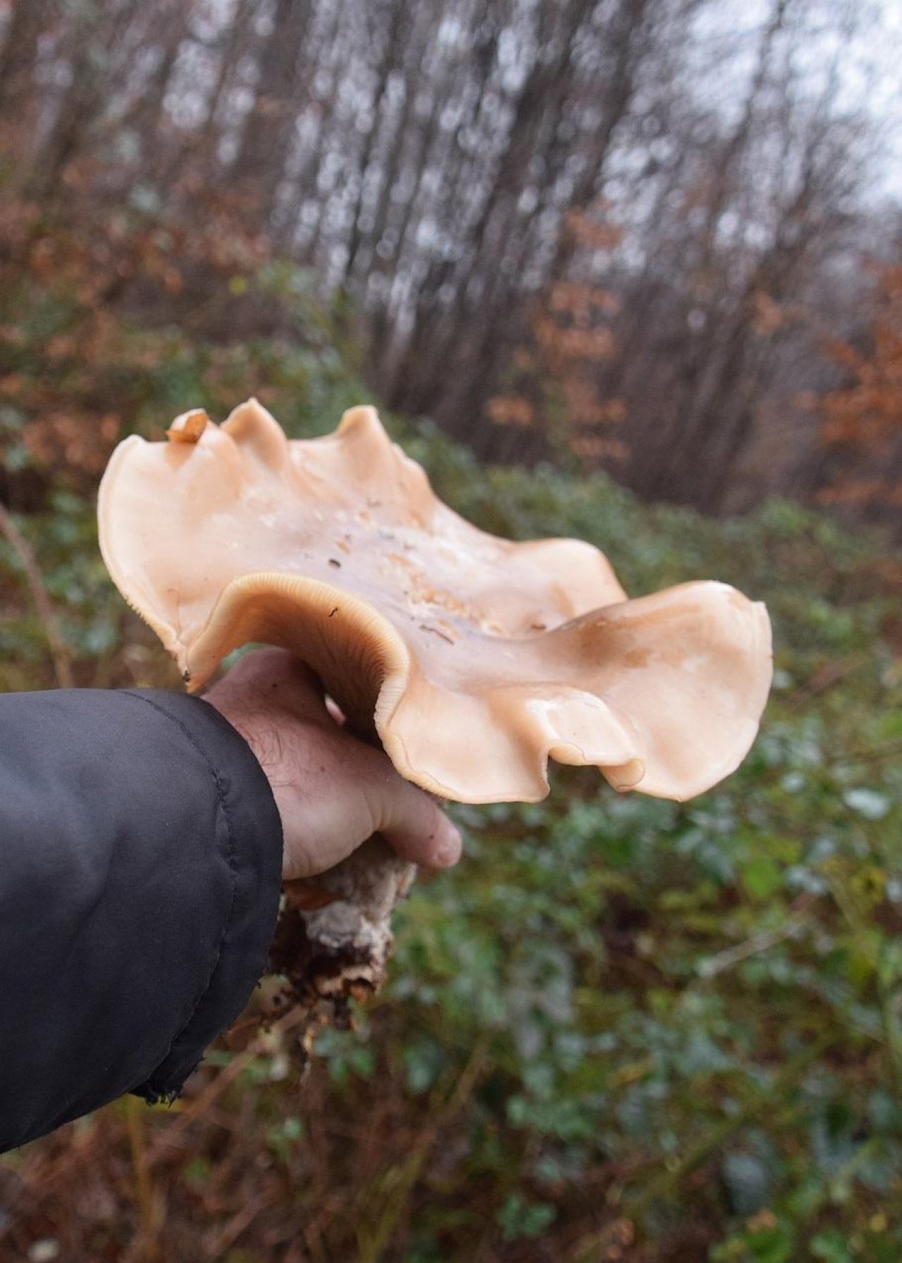 anderer Lamellenpilz (hell) spotted by Markus Sabor: “im Gegensatz zum letzten Fund hat dieser Pilz einen sehr ebenen Hut und keinen Trichter - ?” in the Pilzfinder App on 22.12.2020