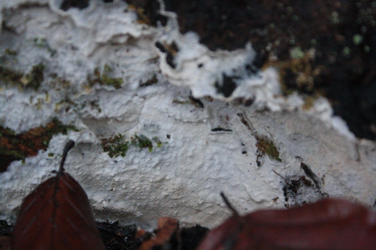 anderer Schichtpilz spotted by Treitner: “Genus Athelia, on a rootstock; conifer; lying; deadwood” in the Pilzfinder App on 20.12.2020