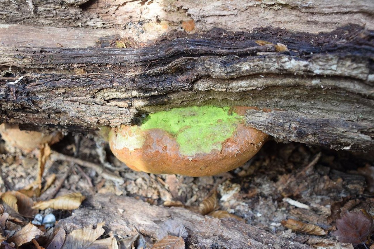 Eichen-Feuerschwamm spotted by Markus Sabor: “auf alter liegender Eiche, 1 Pilzkörper schmückt sich mit grünen Algen” in the Pilzfinder App on 26.12.2020
