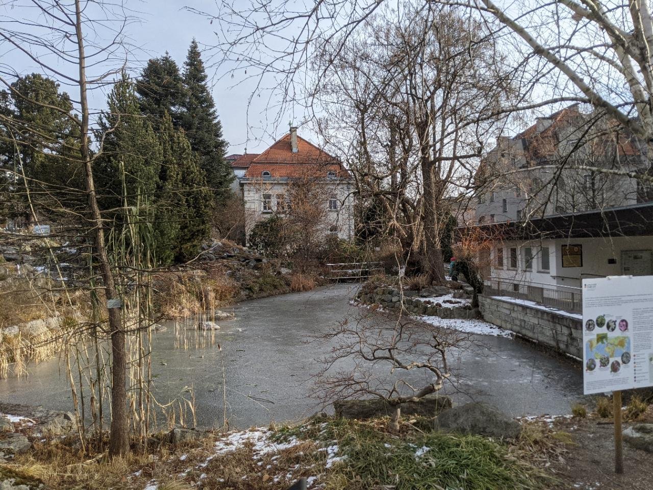 Eine andere krautige Art spotted by Heemuul: “Winterlicher Blick auf den zur Zeit zugefrorenen kleinen Teich beim unteren Eingang des botanischen Gartens in Innsbruck.” in the Naturkalender App on 02.01.2021
