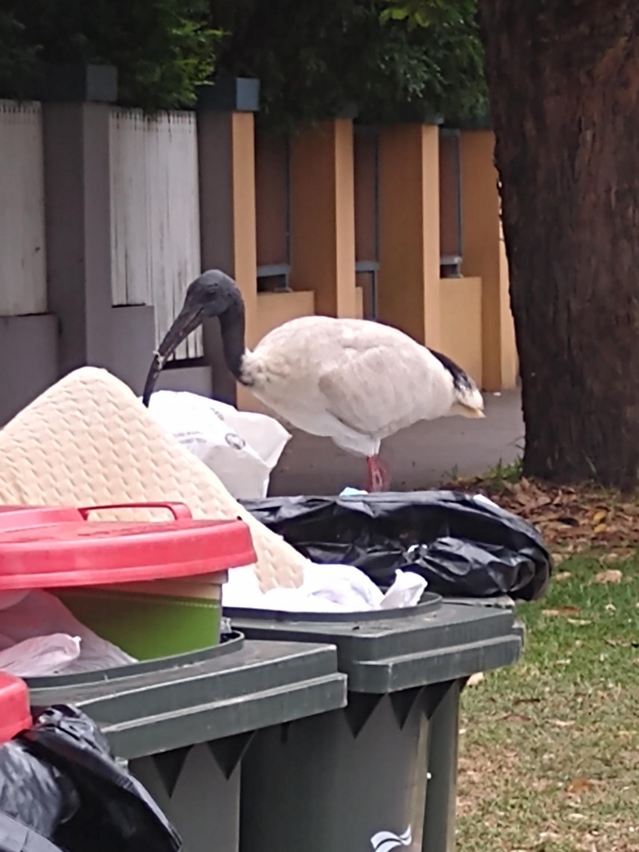initially spotted crossing the road. flew up onto bin and began digging