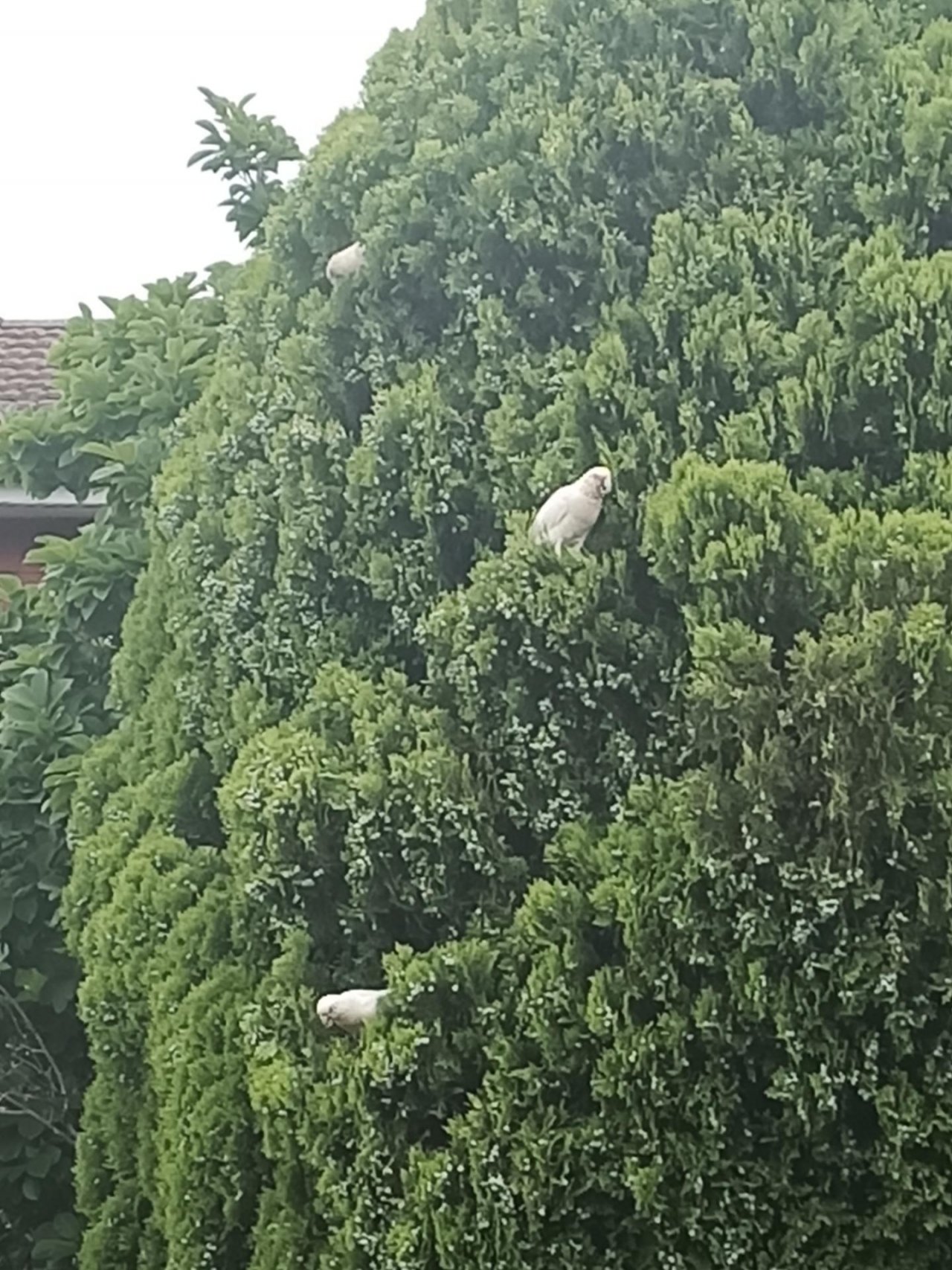 Little Corella spotted by Madi Le M: “Three little corellas eating seeds in a tree with two sulphur crested cockatoos.” in the Big City Birds App on 21.12.2020