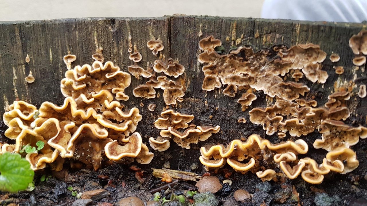 scheibenförmige Pilze spotted by Ka vonSeiten: “Wachsen auf alten Holztrögen hier in der Gasse. Trameten?” in the Pilzfinder App on 23.02.2021