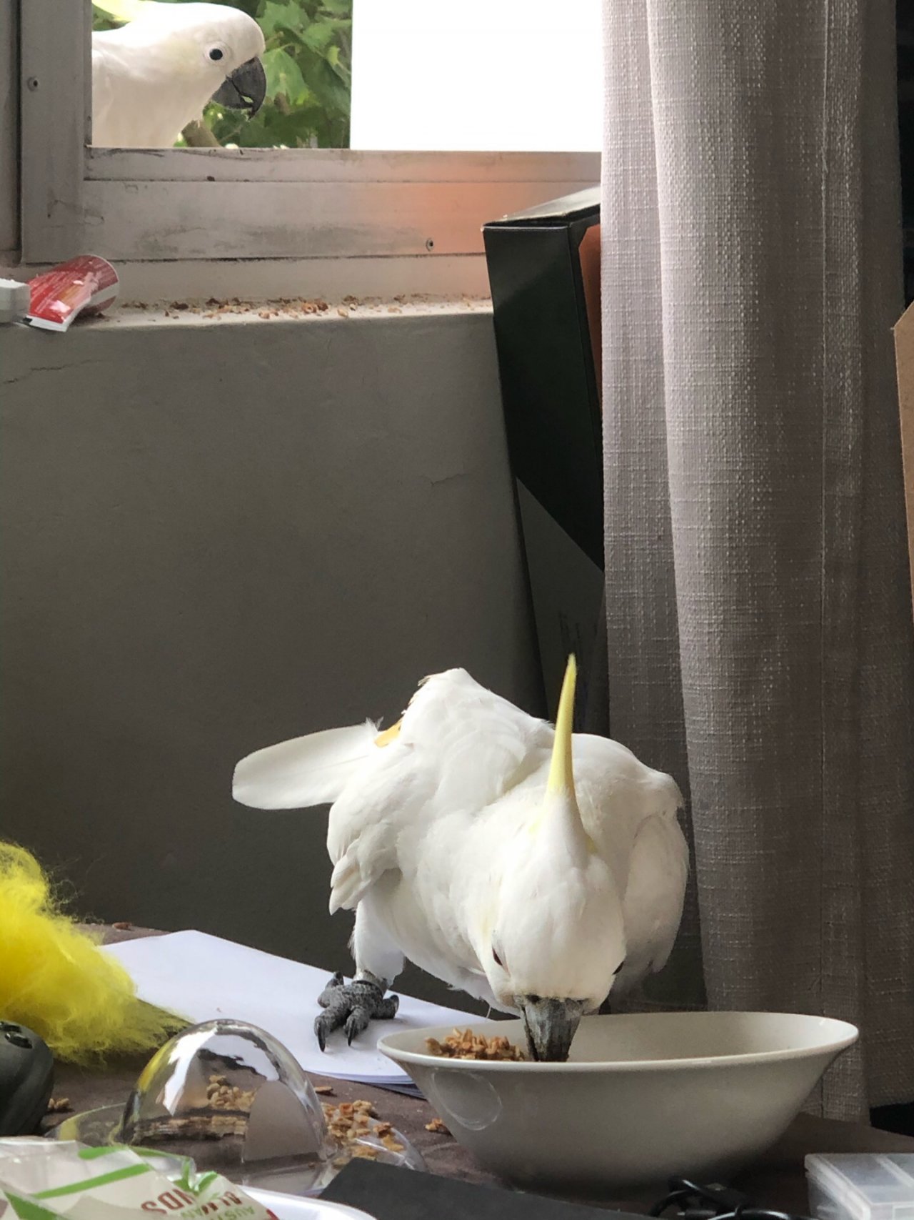 Sulphur-crested Cockatoo spotted by Lexie: “Xavier jumped onto the couch for the first time to get to the food bowl, she then walked over the rug and seemed to be exploring the house” in the Big City Birds App on 14.12.2020