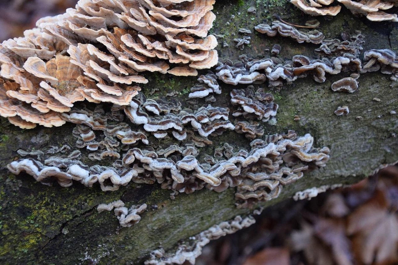 Andere Art spotted by Markus Sabor: “Auricularia mesenterica - Gezonter Ohrlappenpilz, auf gleichem liegendem Stamm wie Schmetterlingstramete, z.T. in enger Nachbarschaft” in the Pilzfinder App on 12.12.2020