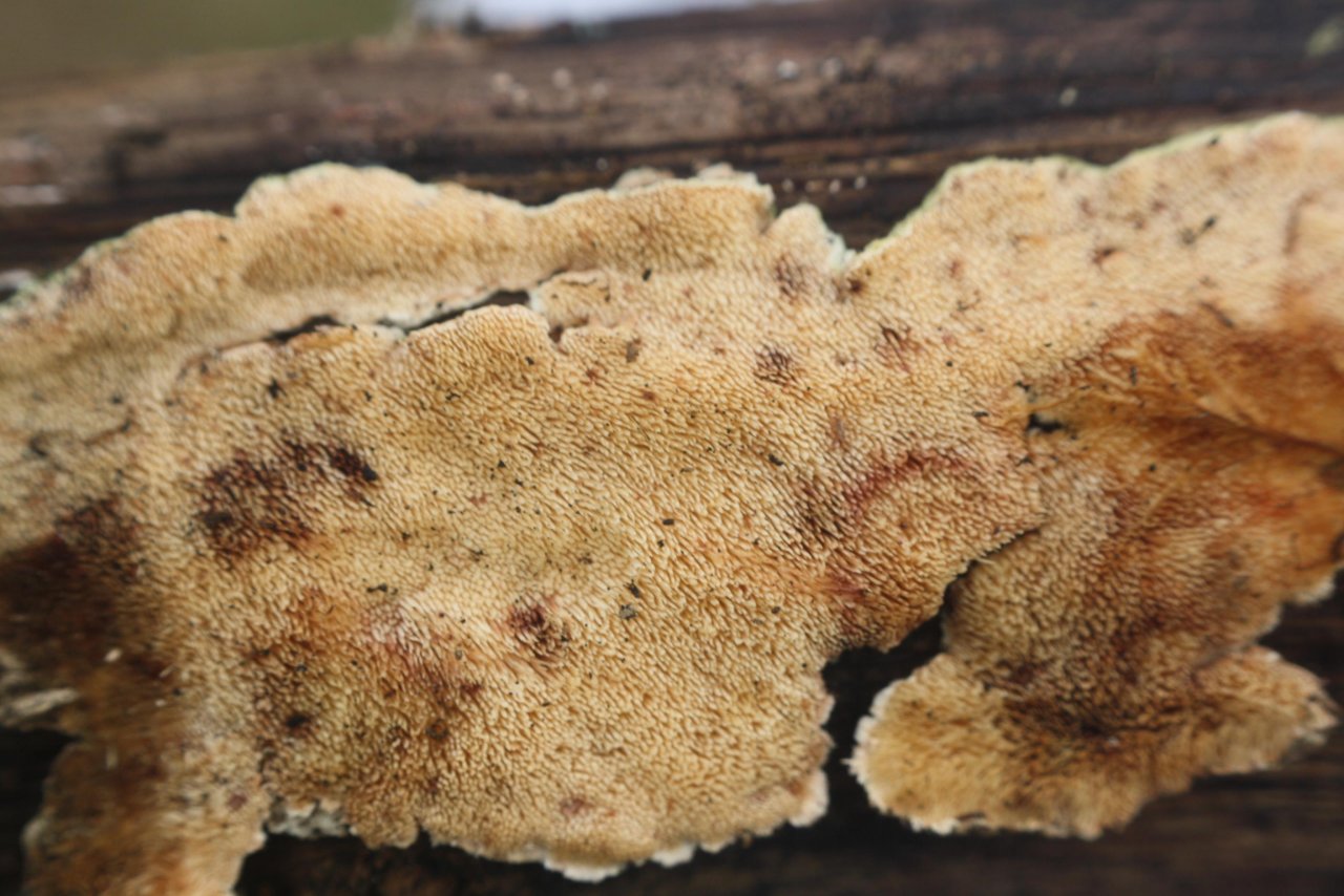 anderer Leistling / Stachelpilz spotted by Treitner: “Ockerrötlicher Resupinatstacheling(Steccherinum ochraceum), on a branch; deciduous tree; deadwood; lying;” in the Pilzfinder App on 12.02.2021