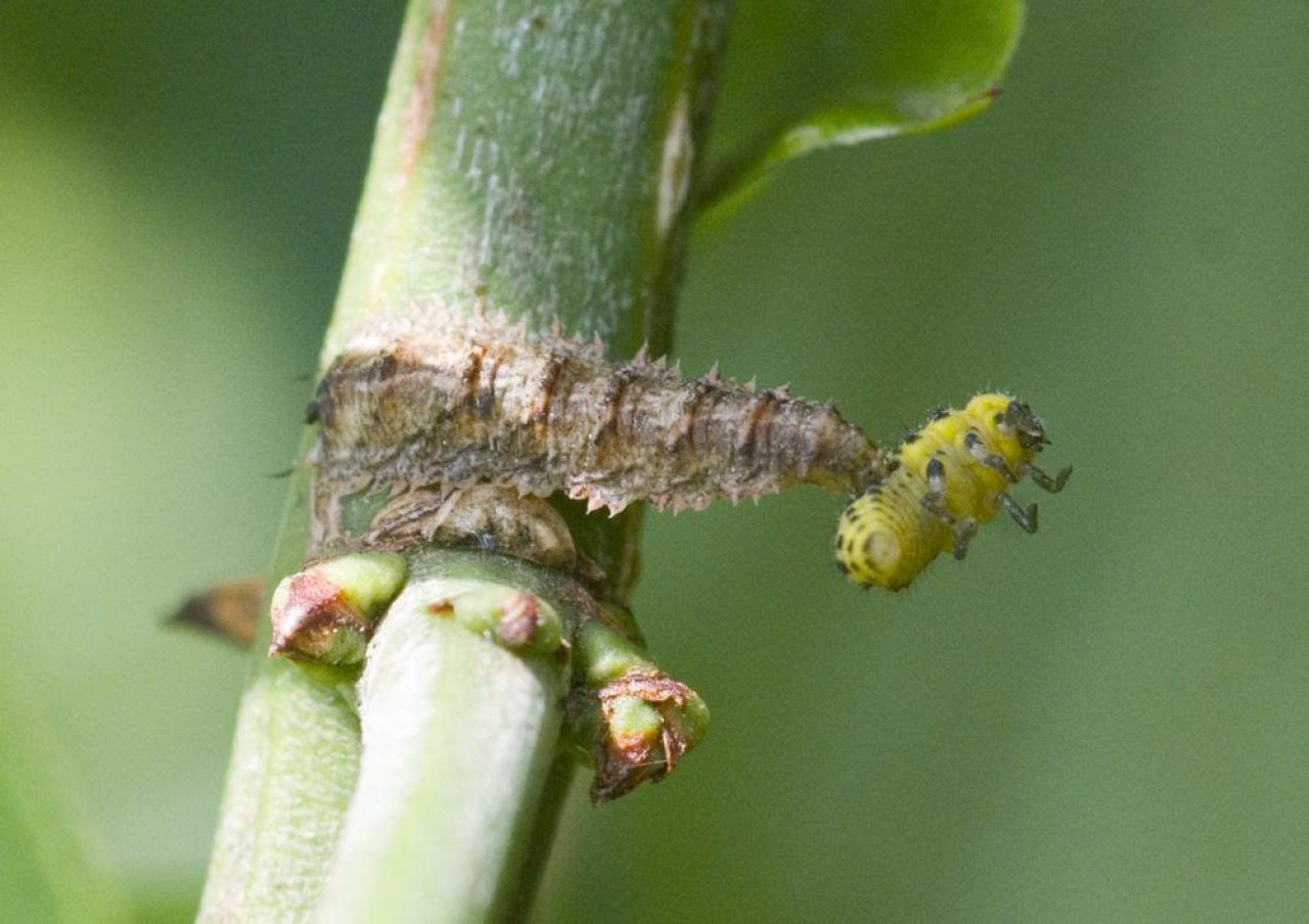 Animals spotted by Danny VG: “Here a larva of Dasysyrphus has indet. to catch a larva of the Psyllobora vigintiduopunctata, one predator loses to the other.” in the NatureSpots App on 06.06.2020