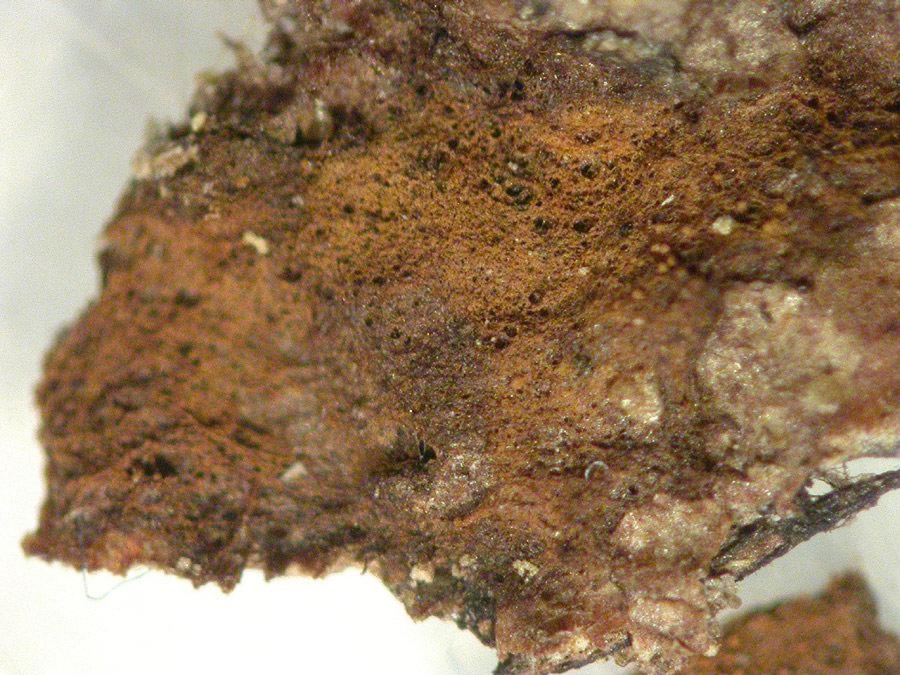 Rostbraune, samtig weiche, leicht vom Substrat lösbare Belege. Hyphenstränge am Rande der Fruchtkörper habe ich nicht gesehen, unter dem Mikroskop konnte ich allerdings stellenweise dichtgepackte Hyphenstränge beobachten.