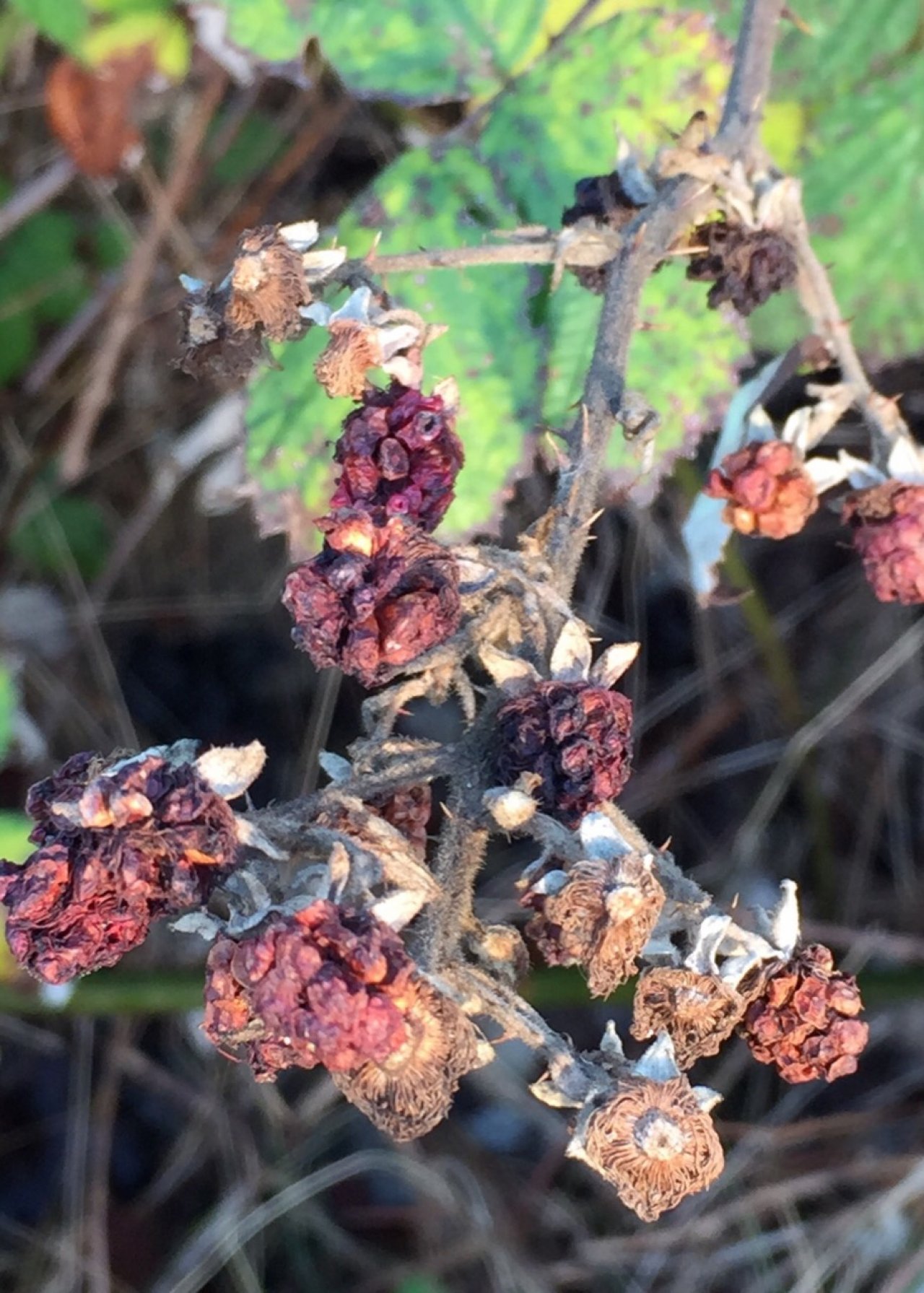 Eine andere Strauchart spotted by Christa Wiener: “auch die eingetrockneten früchte des brombeerstrauches haben noch bei wenig sonnenlicht eine herrliche färbung in dieser jahreszeit ...))) 🔴🔴” in the Naturkalender App on 19.01.2021