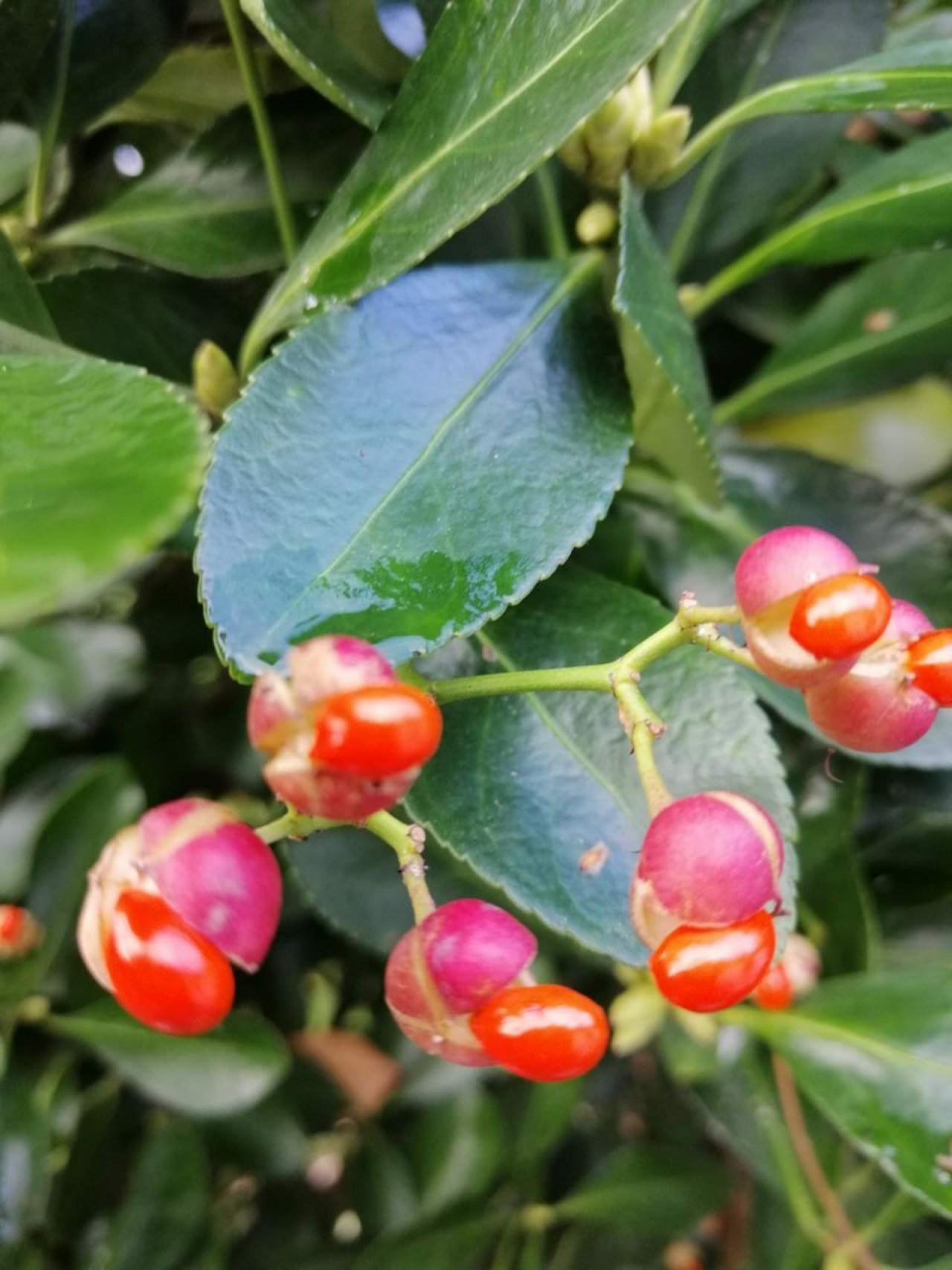 Eine andere Strauchart spotted by Julihele: “Wer kennt diesen wintergrünen Strauch mit d wunderschönen an apfaffenhüttchen erinnernden Früchten?” in the Naturkalender App on 03.01.2021