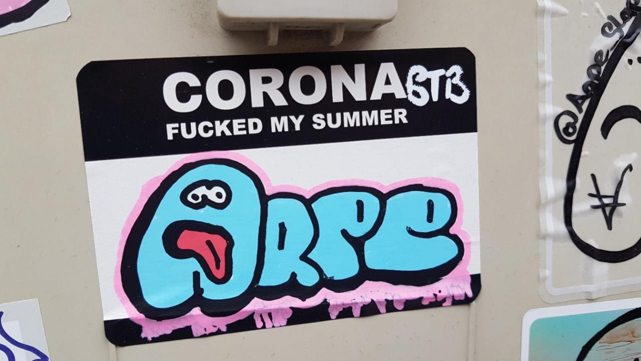 Graffiti spotted by Ka vonSeiten: “Corona fucked my summer. ARPE Tag sticker. #corona #coronavirus #sticker” in the ArtSpots App on 21.02.2021