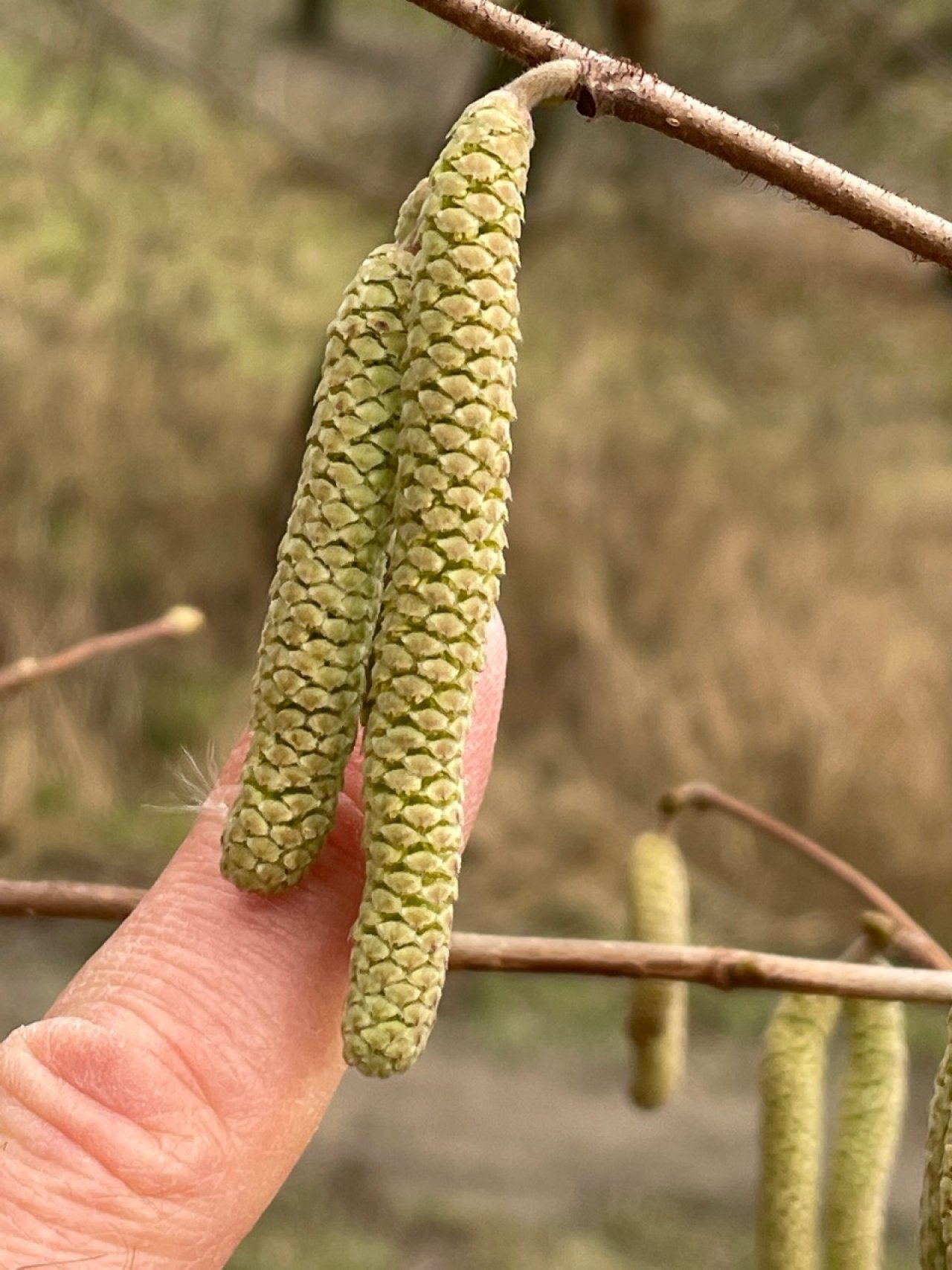 Haselstrauch spotted by Franz: “Die männlichen Haselnussblüten strecken sich, bis zur Blüte ist noch etwas Zeit.” in the Naturkalender App on 25.01.2021