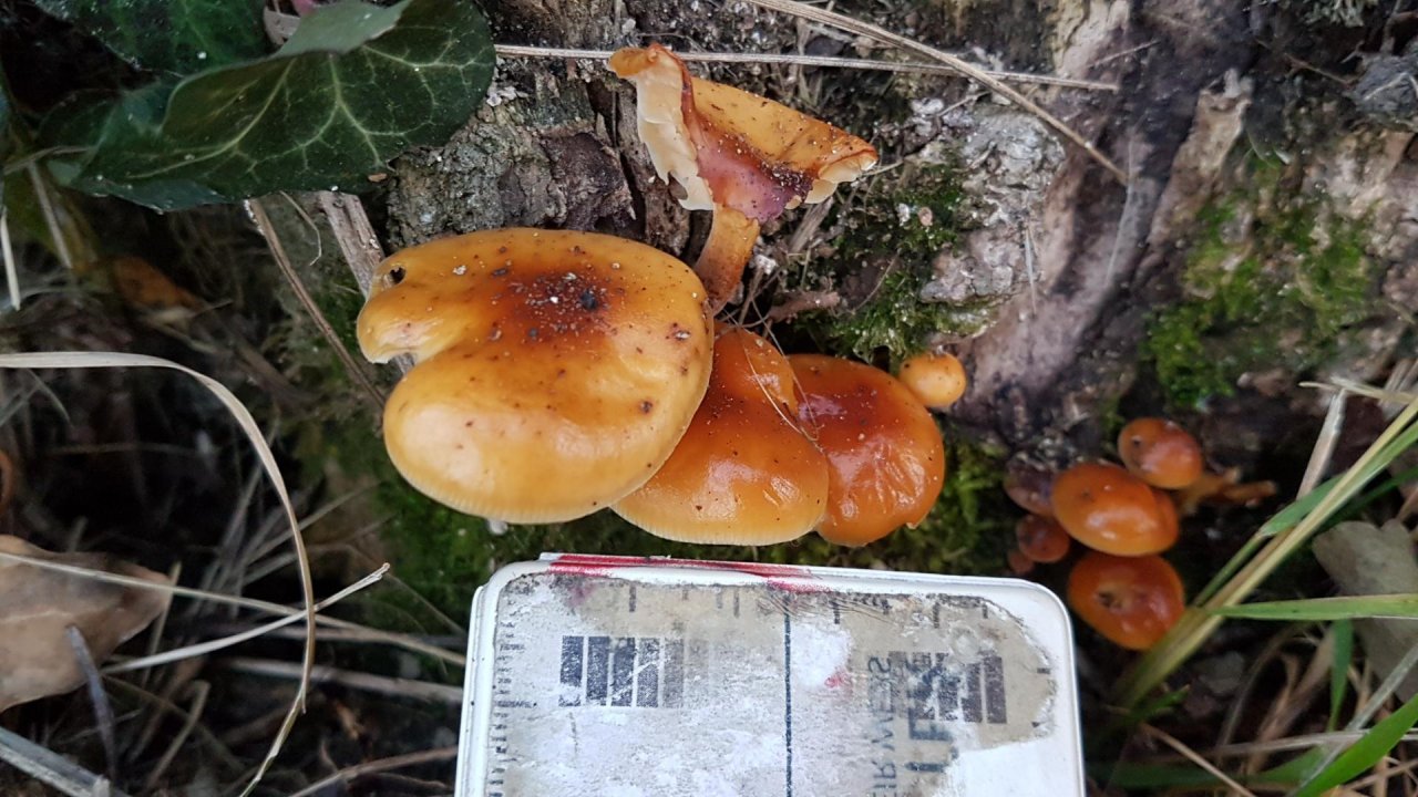 Helle Lamellen spotted by Ka vonSeiten: “Auf altem Efeustunk im Belvedere Wien, Leuchtend orange Pilze hinter der Hecke.” in the Pilzfinder App on 30.12.2020
