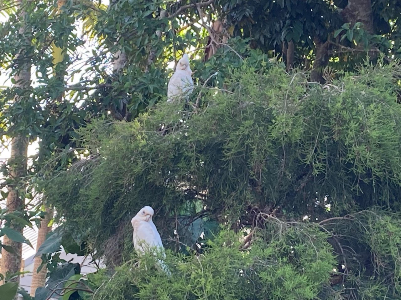 Little Corella spotted by Feather: “Pair of birds sitting in the tree calling the occupant to feed them. Brush turkey present at base of tree scavenging.” in the Big City Birds App on 15.12.2020