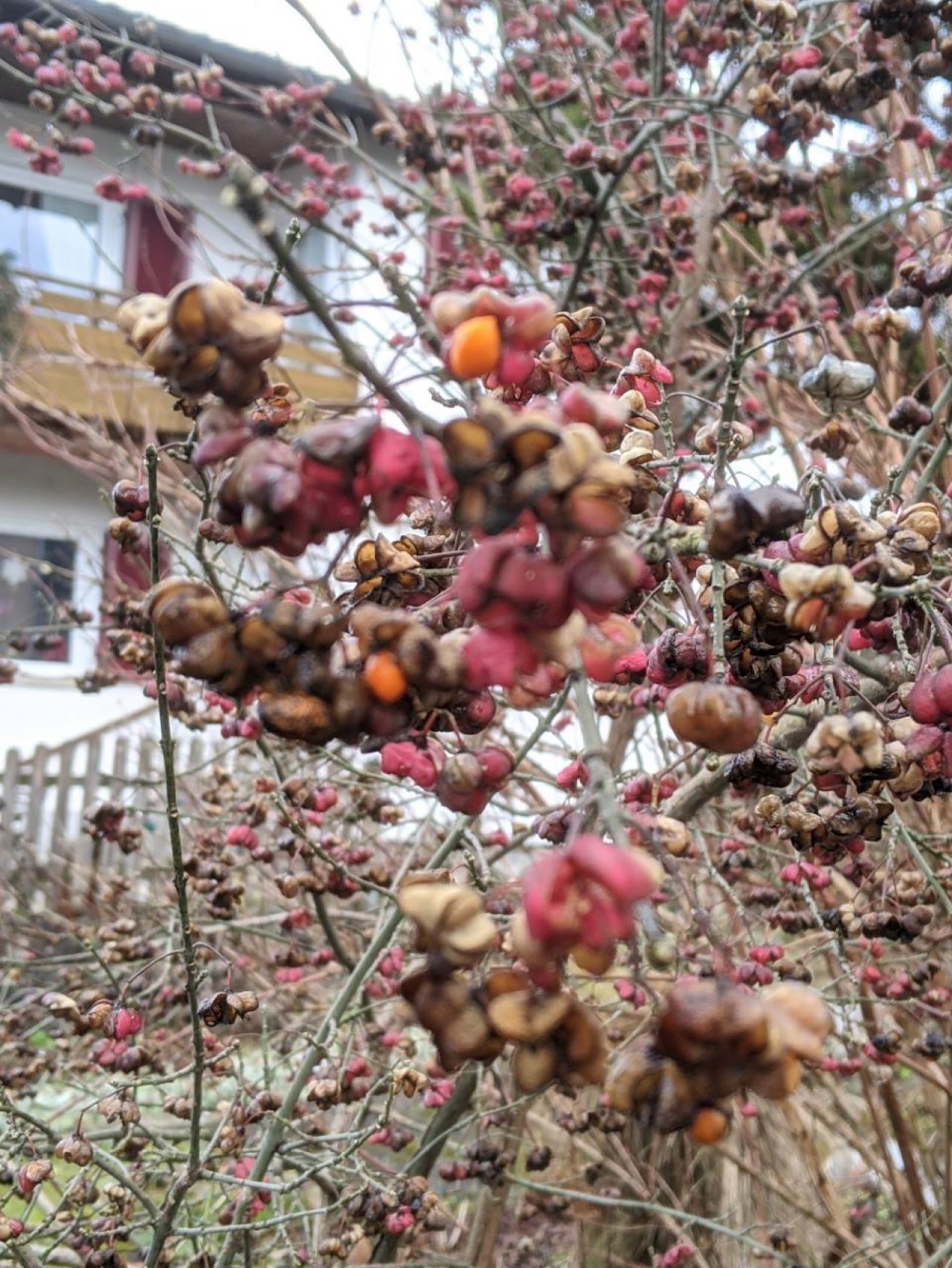 Pfaffenhütchen / Gewöhnlicher Spindelstrauch spotted by Heemuul: “Pfaffenhütchen - Früchte im Winter, noch Recht viele Samen.” in the Naturkalender App on 24.12.2020