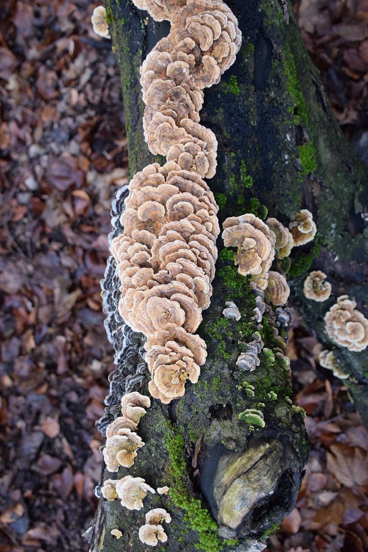 Schmetterlingstramete spotted by Markus Sabor: “gemeinsam mit Auricularia mesenterica - Gezonter Ohrlappenpilz” in the Pilzfinder App on 12.12.2020