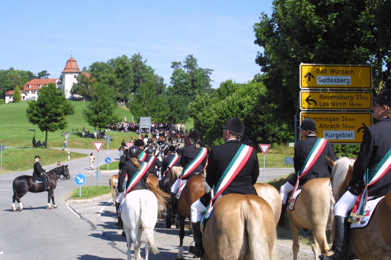 Jährlich am zweiten Freitag im Juli findet in Bad Wurzach das traditionsreiche Heilig-Blutfest, auch "Blutfreitag" genannt, mit ca. 1.500 Reitern und mehr als 5.000 Wallfahrern und Besuchern statt. Der Bad Wurzacher Blutritt ist damit eine der größten Reiterprozessionen zu Ehren des Heiligen Blutes Christi in Europa. Im Mittelpunkt der Veranstaltung steht die Verehrung einer Heilig-Blut-Reliquie. Das blutgetränkte Tuchstück wird während der Prozession durch die Stadt und durch die Flure und Felder in einem vergoldeten Reliquiar mitgeführt. Alle Pferde sind festlich geschmückt und die Reiter tragen Festtagskleidung. [...]
