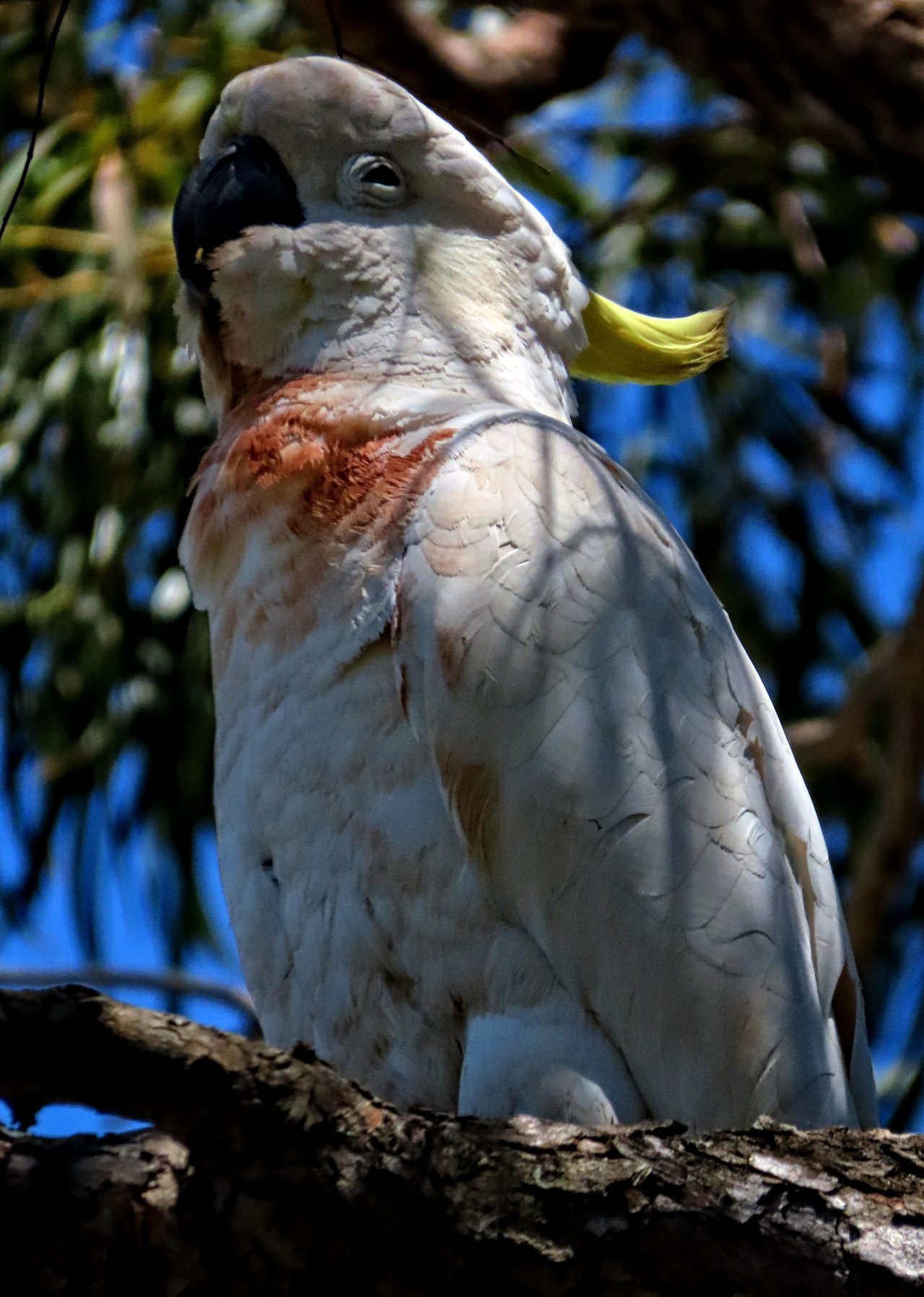 Sulphur-crested Cockatoo spotted by Bill de Belin: “Has what appears to be blood on throat. Sat in tree all day.” in the Big City Birds App on 15.11.2020