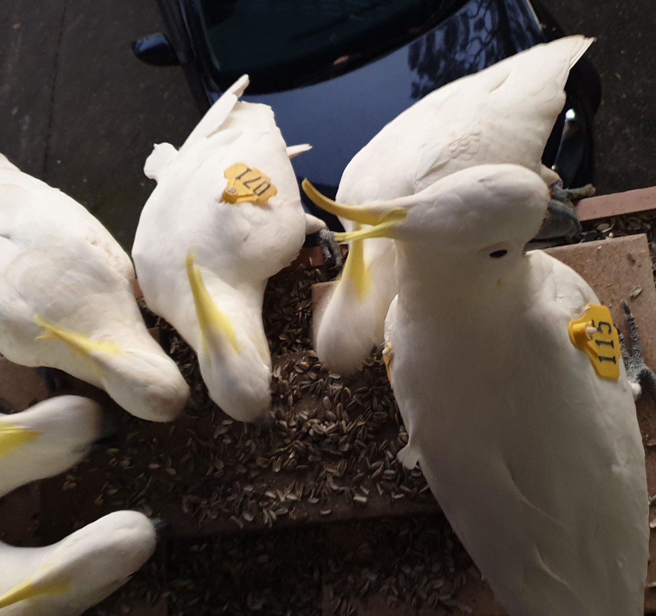 Sulphur-crested Cockatoo spotted by BirdwatcherCT: “Both tagged birds are among the flock of about 10 - 15 birds that start screeching when they see me come home.” in the Big City Birds App on 16.01.2021