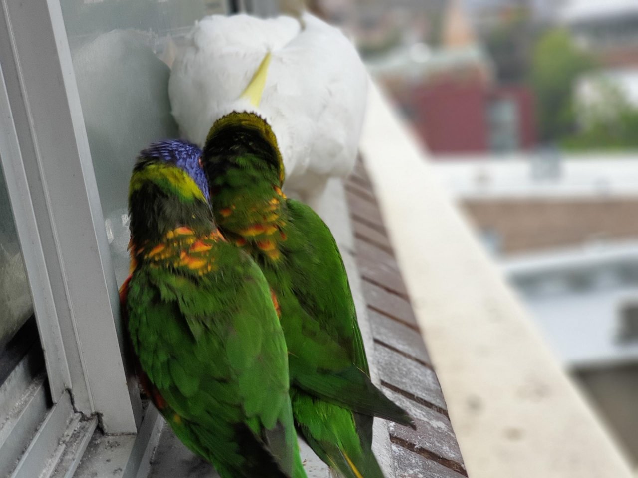 Sulphur-crested Cockatoo spotted by TomMassey: “Cockatoo and two lorikeets having a small fight about who gets to sit on the window ledge.” in the Big City Birds App on 15.12.2020