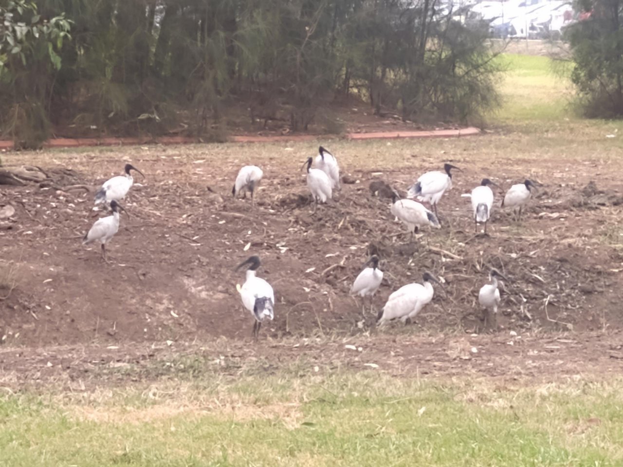 White Ibis spotted by Anna: “Group of about 20 ibises closeted together on a patch of diatribes earth by a little creek/ditch in a park. Some picking around in the dirt but mostly just standing around & preening” in the Big City Birds App on 09.03.2021